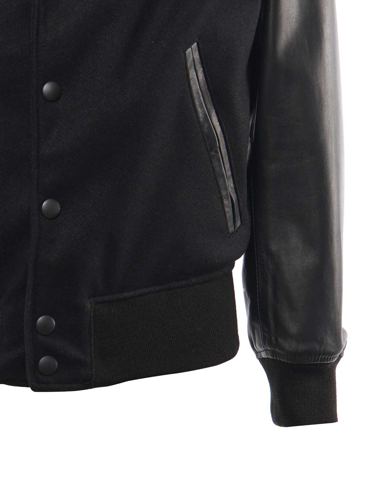 フロントボタン留め、レザースリーブ、リブ編みの襟、袖口、裾、サイドポケット、レギュラーフィット、イタリア製、写真のサイズは50、色:黒