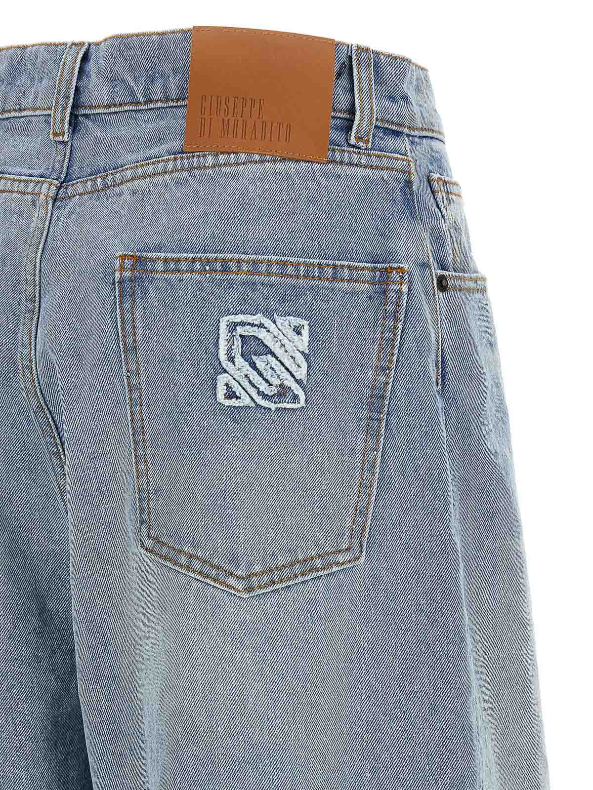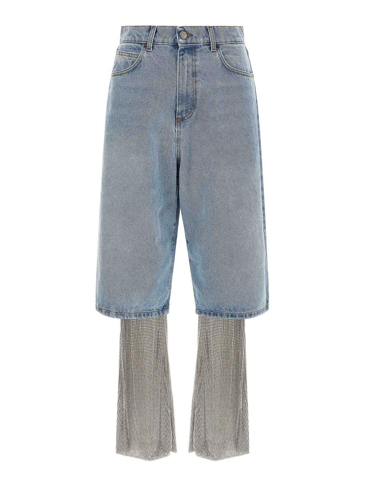 コットンデニムジーンズのバミューダパンツ、コントラストステッチ、ワイドレッグ、フロントジッパーとボタンクロージャー、5つのポケット、ロゴインターシャ、バックレザーのロゴタグ、全体にクリスタルを施したストレッチ生地のレギンス、伸縮性のあるウエストバンド、フレアレッグ、裏地からなるアンサンブル。