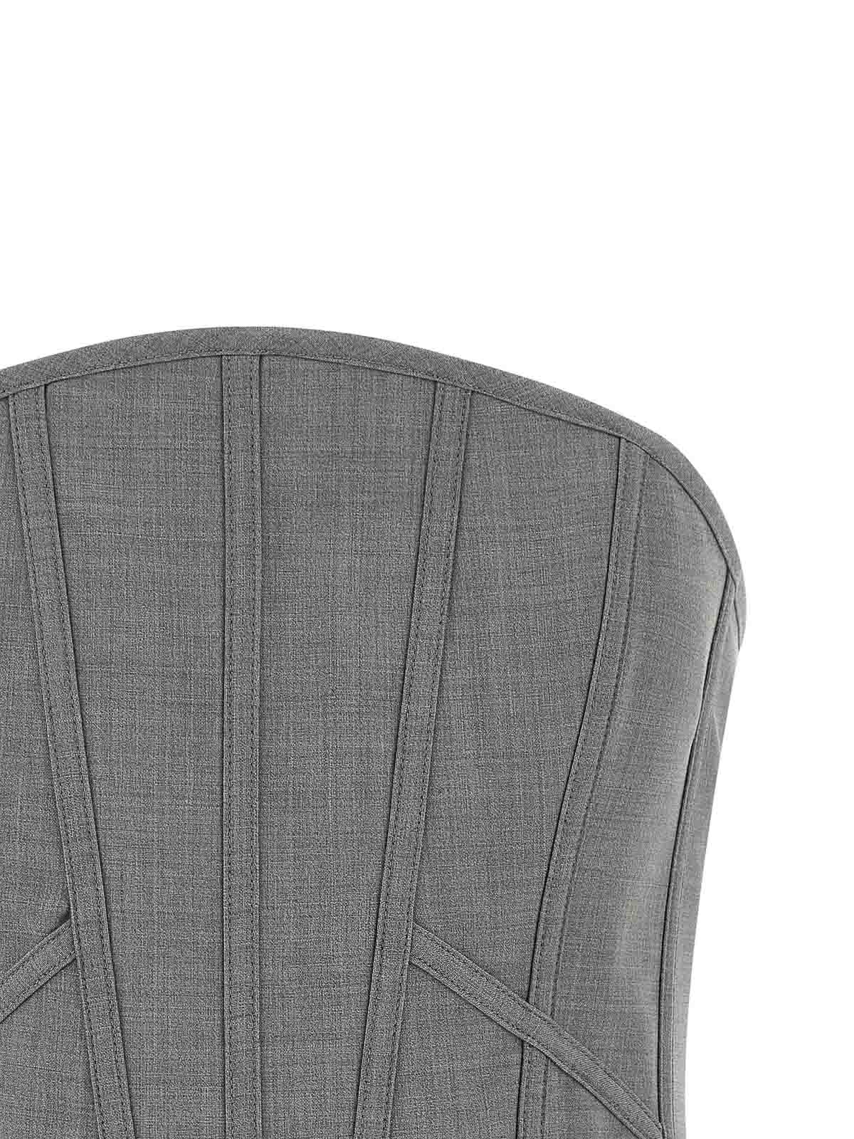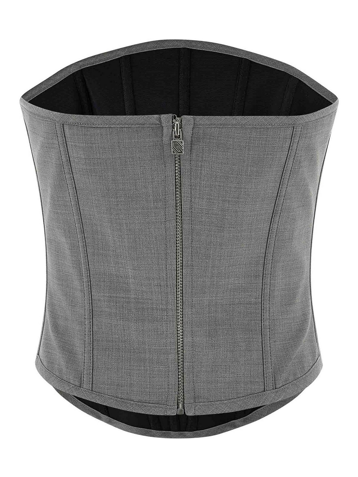 クールで繊細なバージンウールのトップス。半硬質のスプリントをあしらったオフショルダーのビスチェスタイル。バックジッパー付き、左右非対称のヘム。