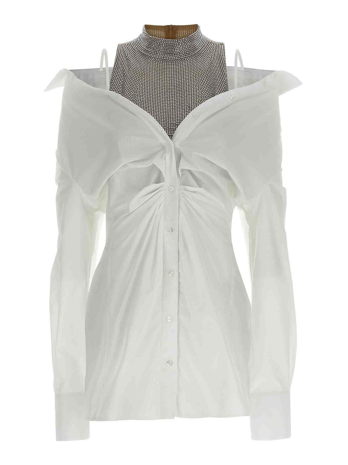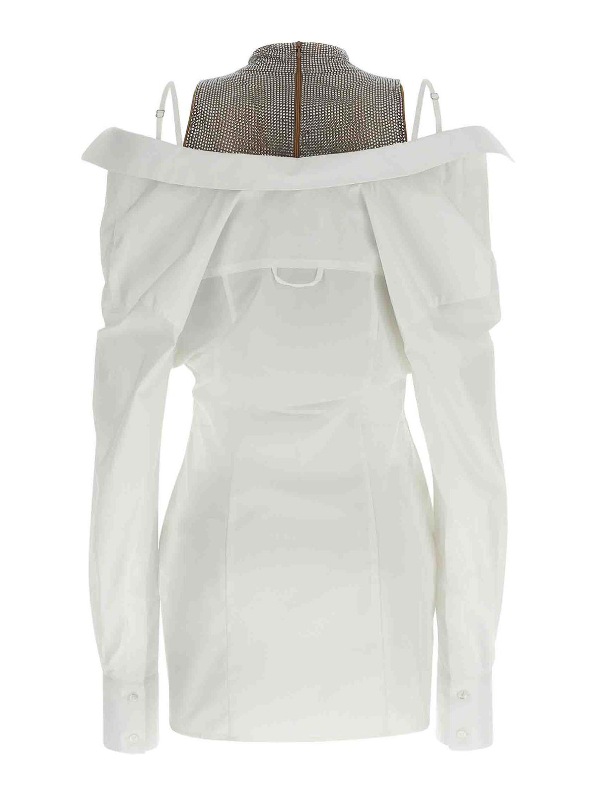 全体にラインストーンのアップリケをあしらったファブリックトップ、ハイネック、クロップスタイル、バックジッパー、コットンポプリンドレスで構成されたミニドレス。ケミシェモデル、調節可能なブレース、ウエストとフロントボタンクロージャー、カフス付きロングスリーブ。
