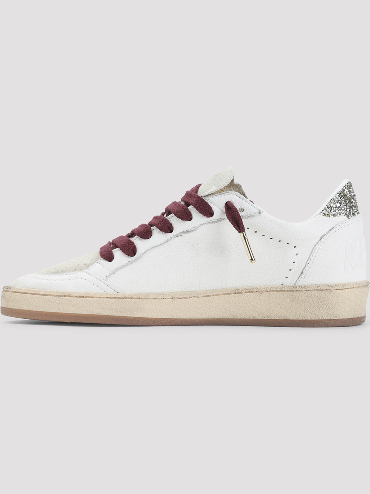 オールデングースボールスターホワイトカウレザースニーカー。全体にユーズド加工を施したバンプ。丸いつま先、トップに穴あきディテール、バーガンディのレースアップファスナー、タンにブランドラベル、サイドにレオパードカーフヘアの星型インサート、バックとサイドにロゴ刻印、かかとにグリッターインサート、レザーインソール、黄ばんだゴム製アウトソール。