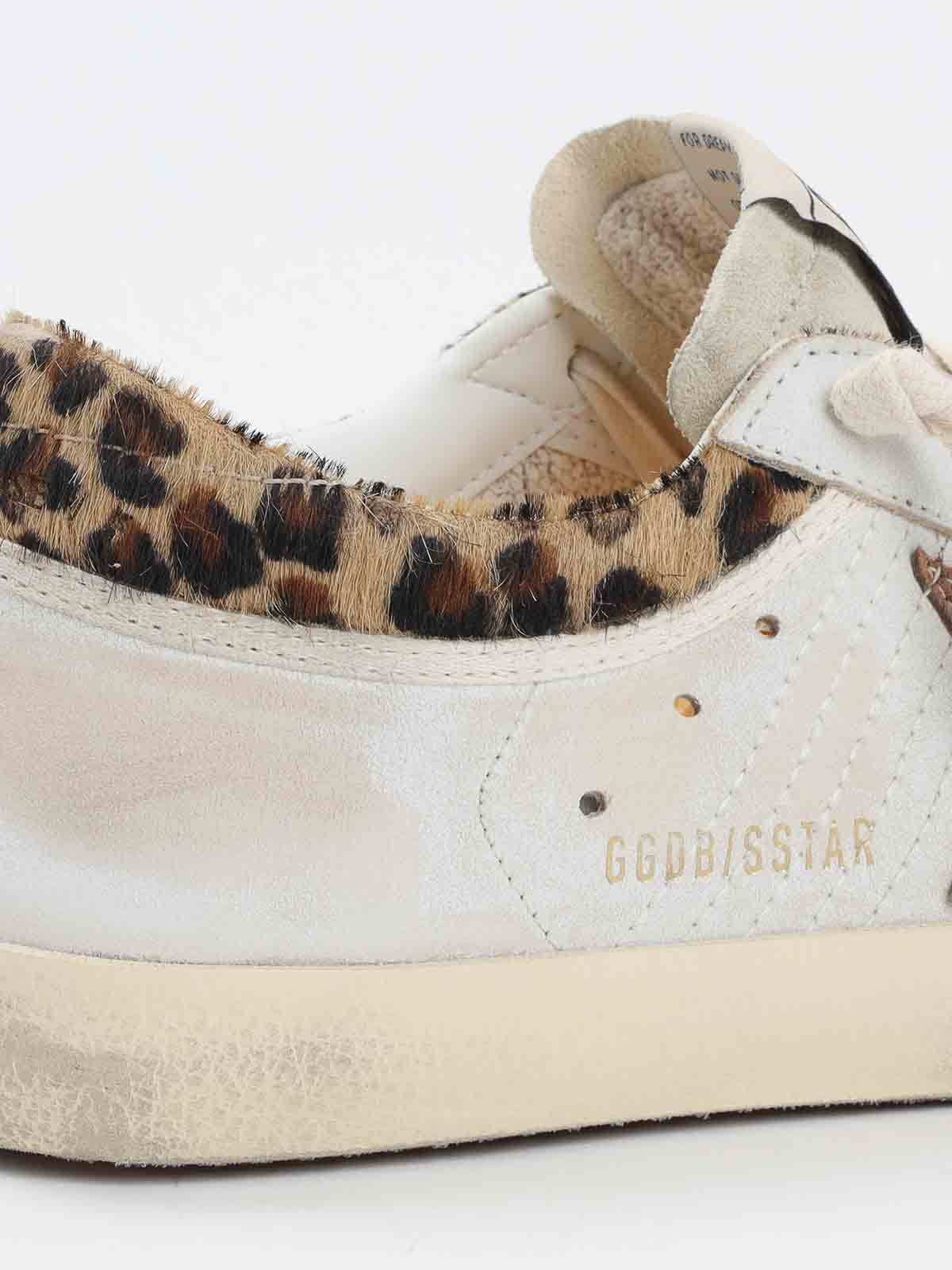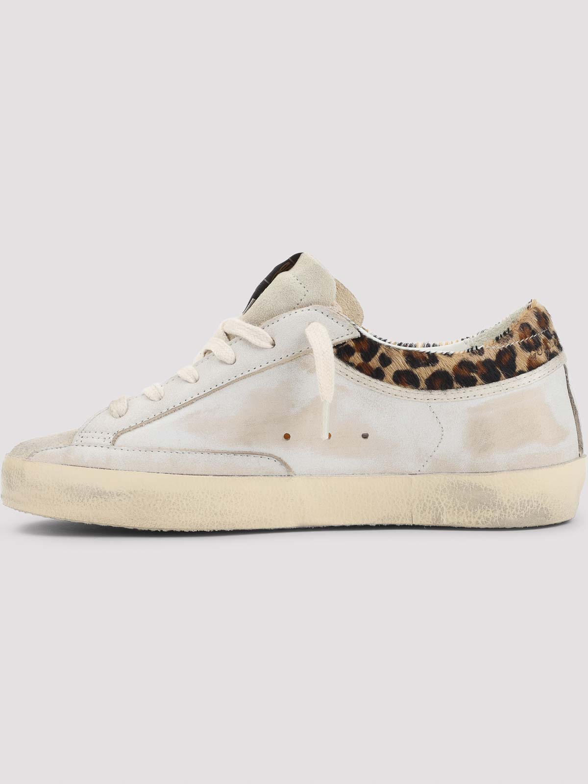 ゴールデングースホワイトカウレザースーパースタースニーカー。ピュアカウレザースニーカー、ラウンドトゥ、トップレースアップファスナー、タンにパッチロゴ、サイドにブラウンのシグネチャースターディテール、サイドにゴールドトーンのレタリングロゴ、エッジにヒョウプリント、ベージュラバーソール、オーバーユースエフェクト。