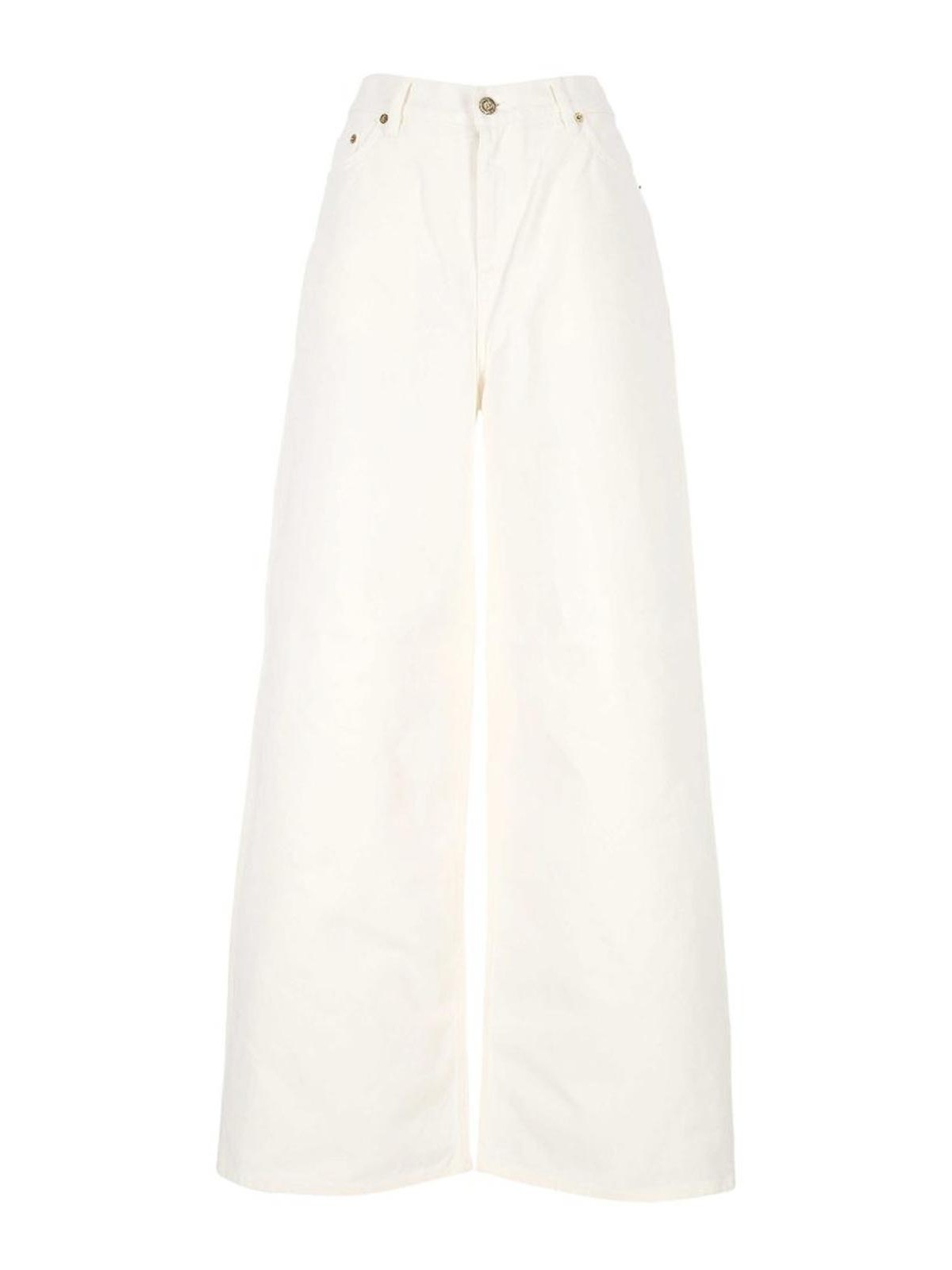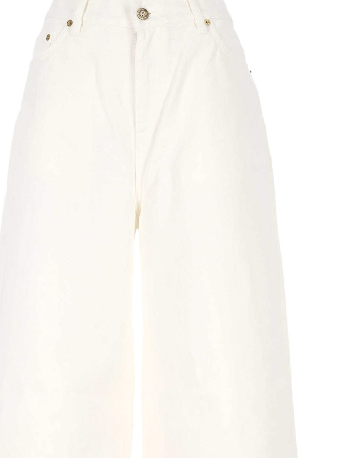 ホワイトワイドレッグベルトループ、フロントボタン、ファスナー留め、クラシックな5ポケット