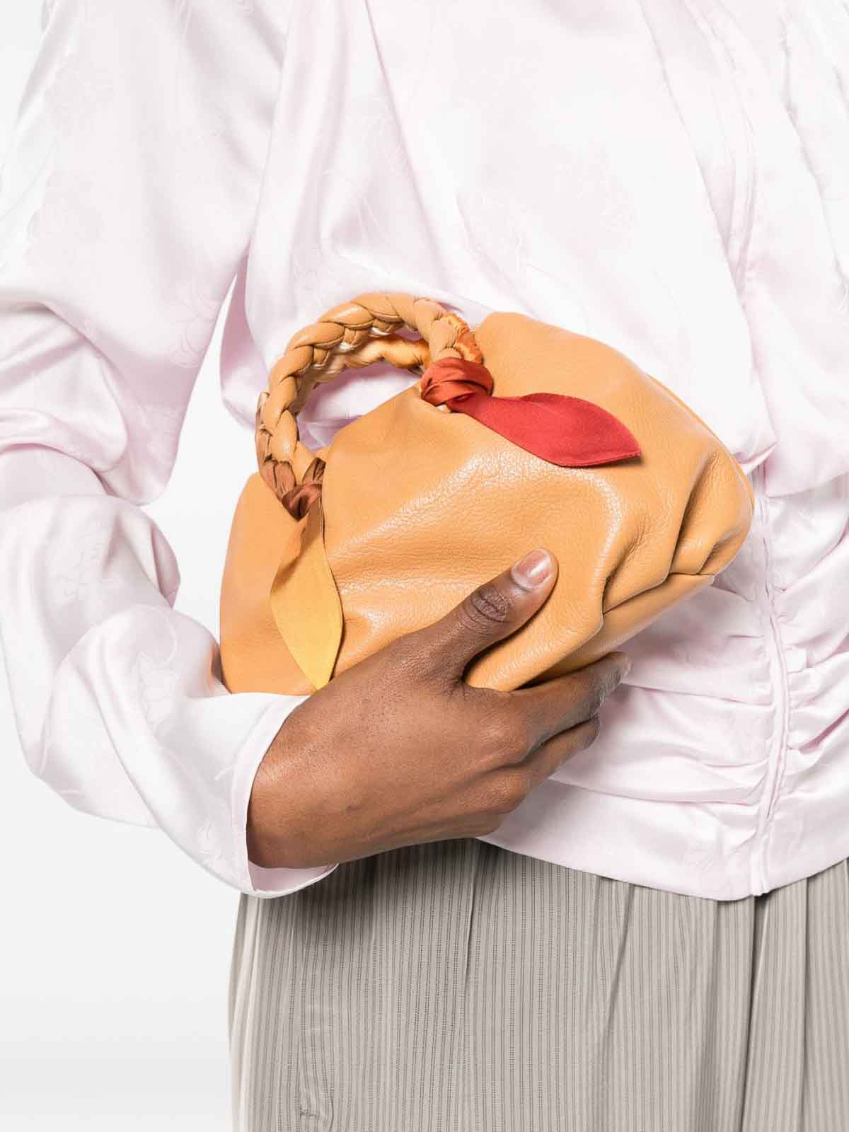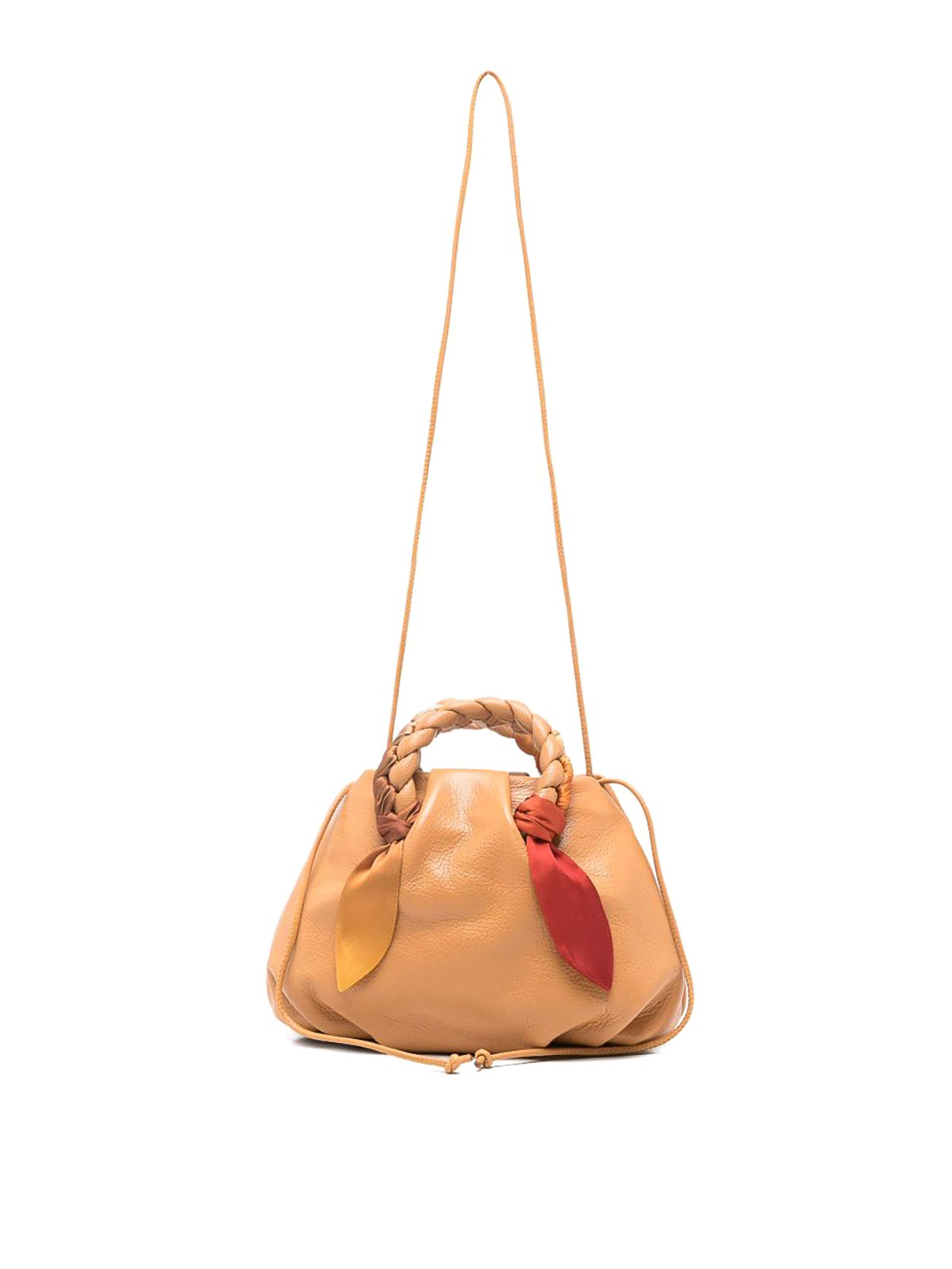 茶色のトップハンドル、ドローストリング留めノットのディテール。この商品には保護用のダストバッグが付いています。