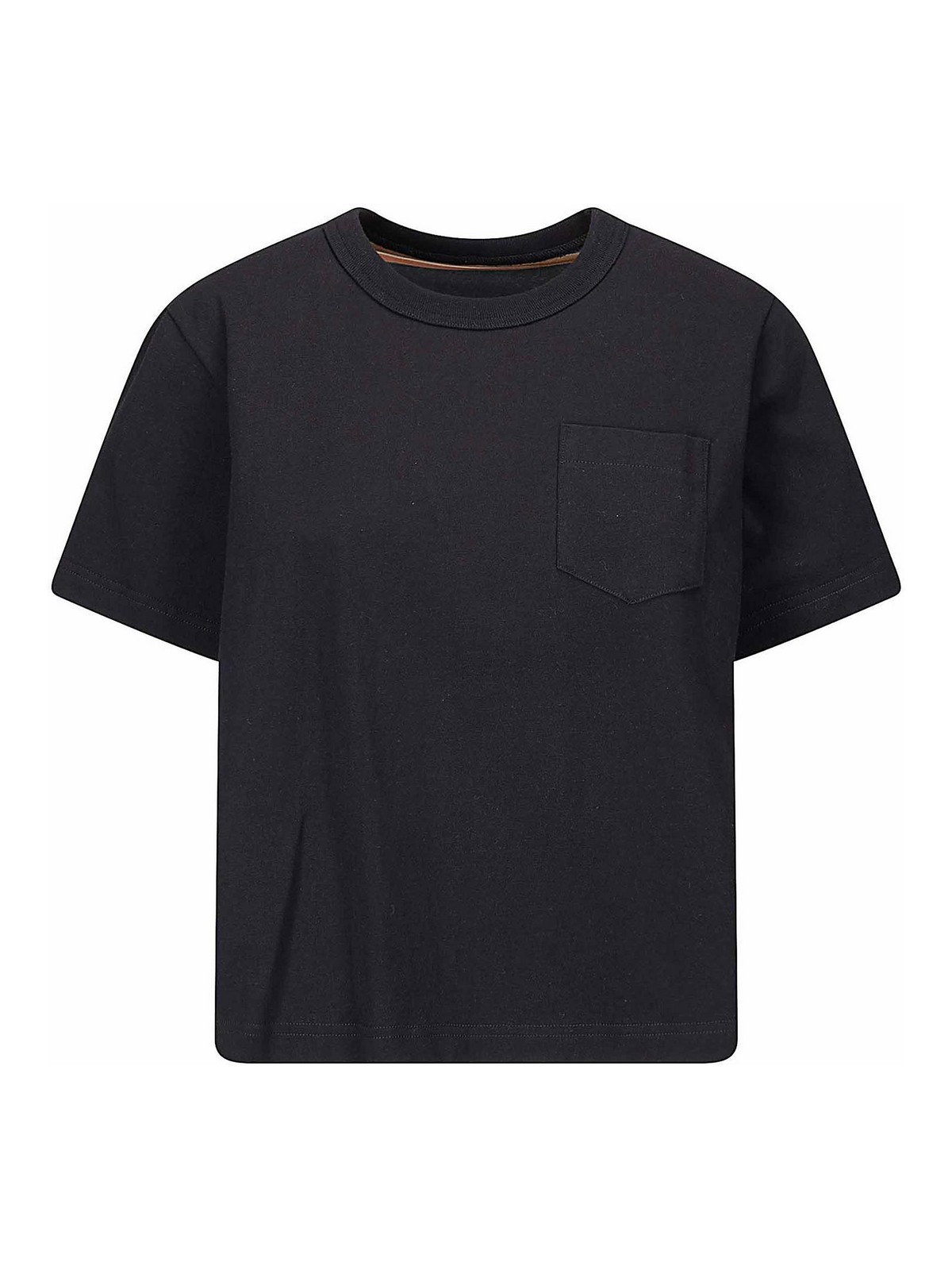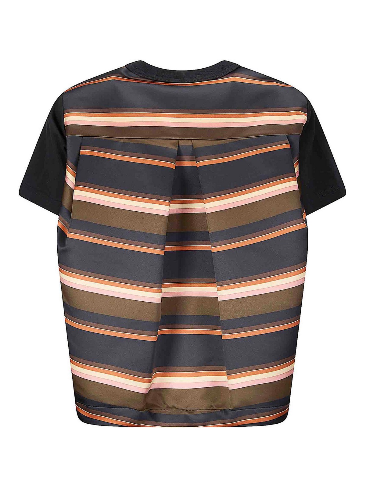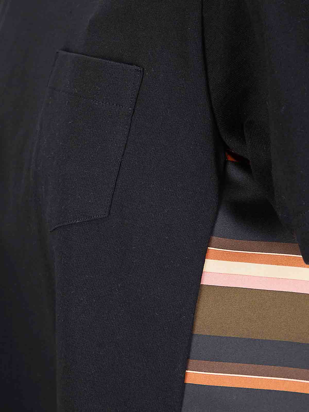 パネルTシャツ、背面は光沢のあるポリエステル製で、横縞模様のプリントとステッチが施され、前面はポケット付きのコットンTシャツです。