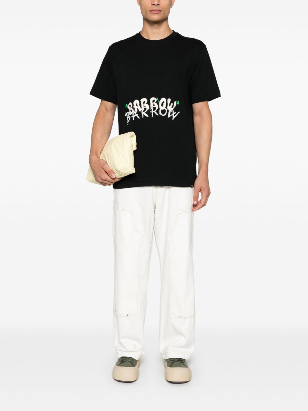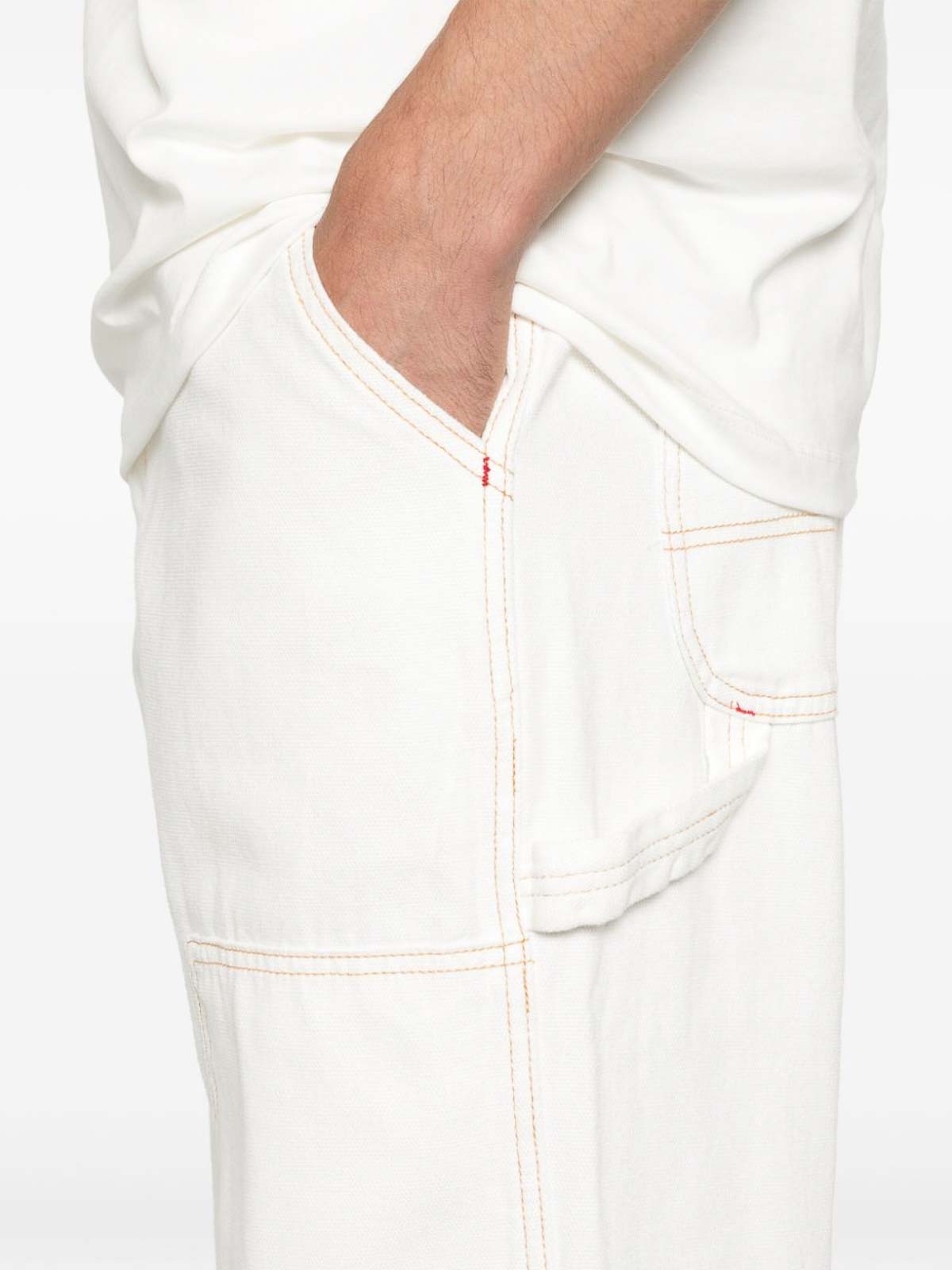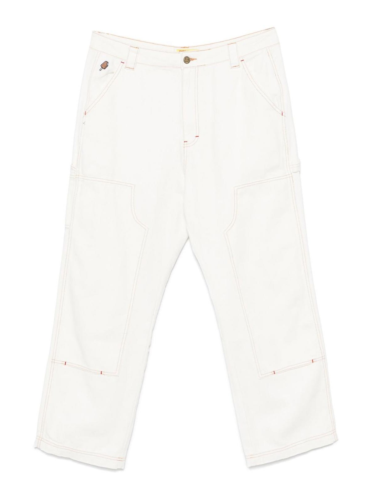 エクリュコットンキャンバスのフロントボタンとジッパー留め、フロントにコントラストステッチのロゴパッチ、サイドに斜めポケット2つ、リアパッチポケット2つ、リアストレートレッグにロゴパッチ