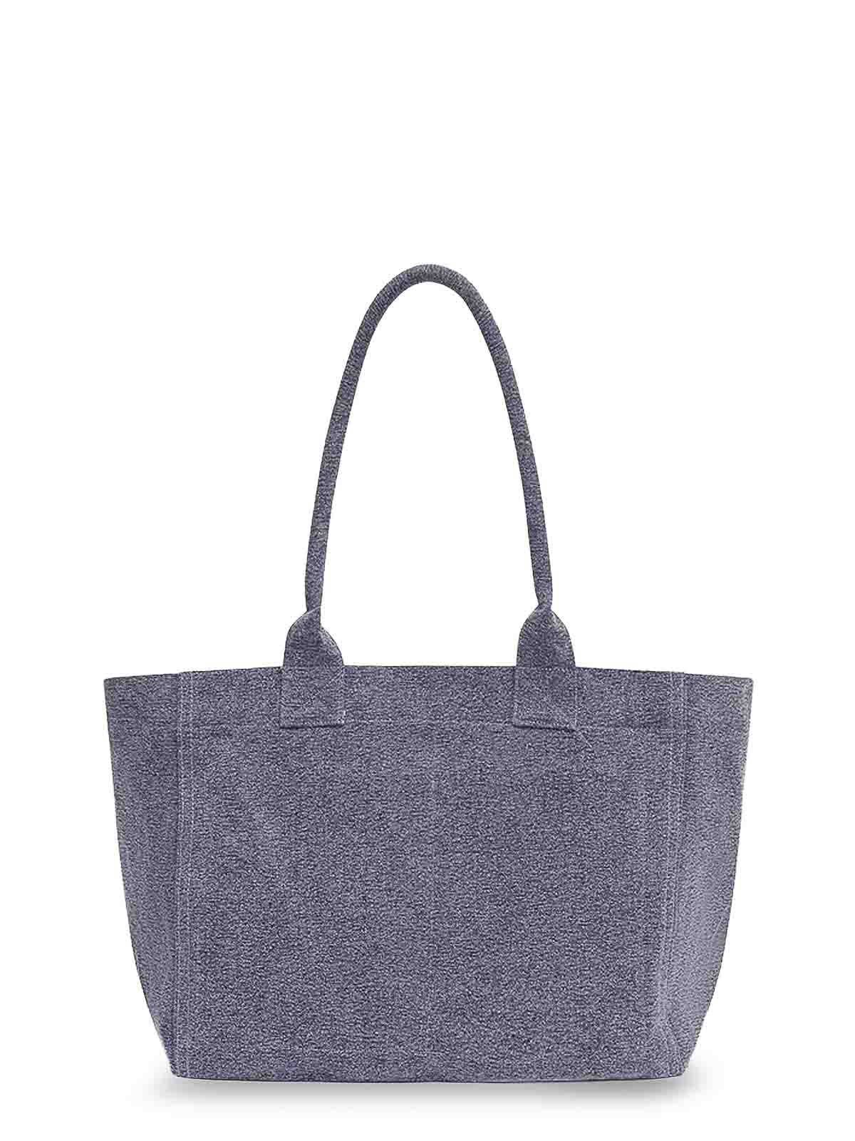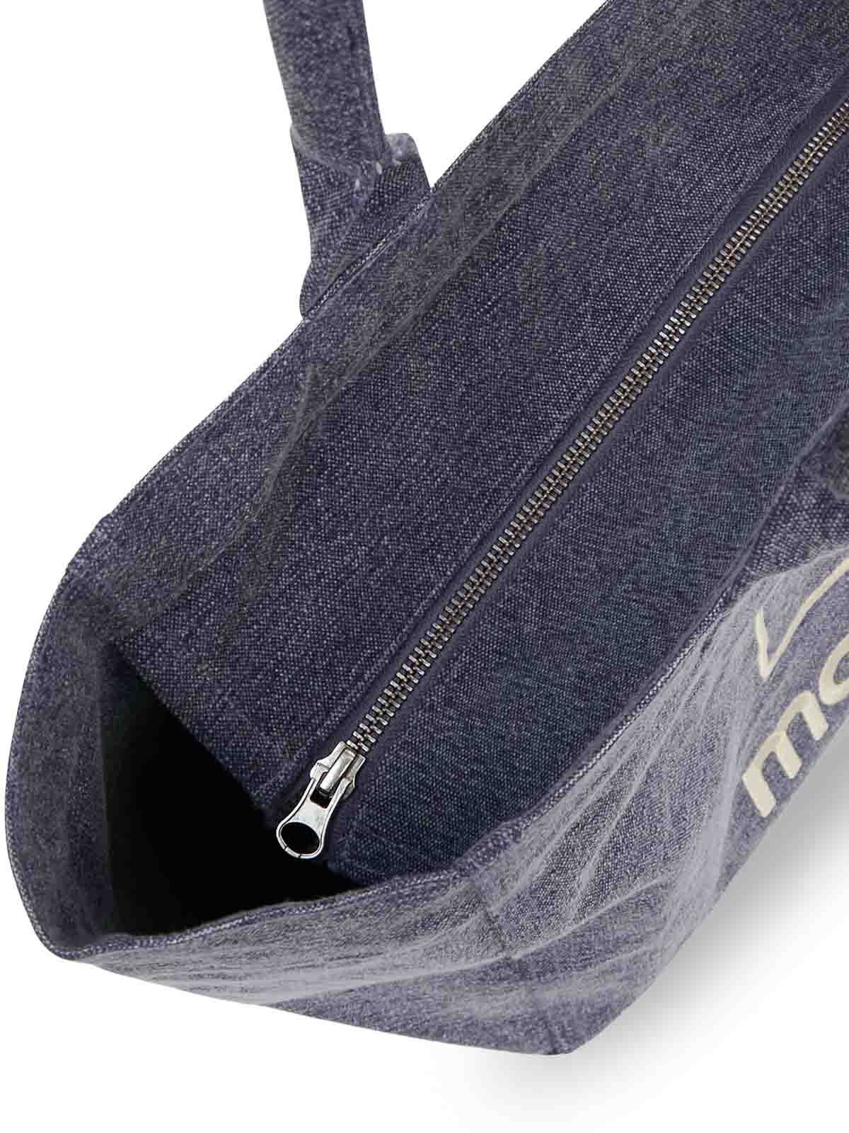 ファスナー開閉、コットンハンドル2つ、前面にロゴ刺繍、内側にフラットポケット2つ、綿100%、幅:35cm x 高さ:28.5cm x 奥行き:16cm。