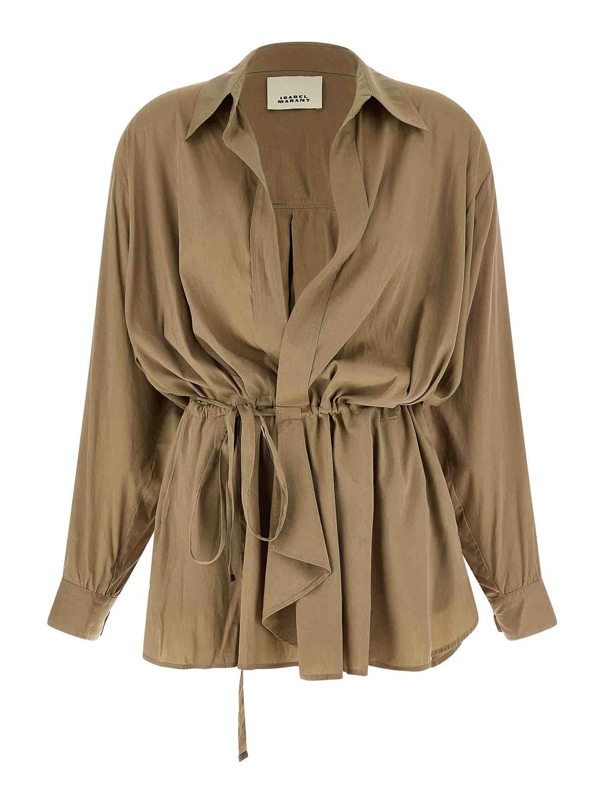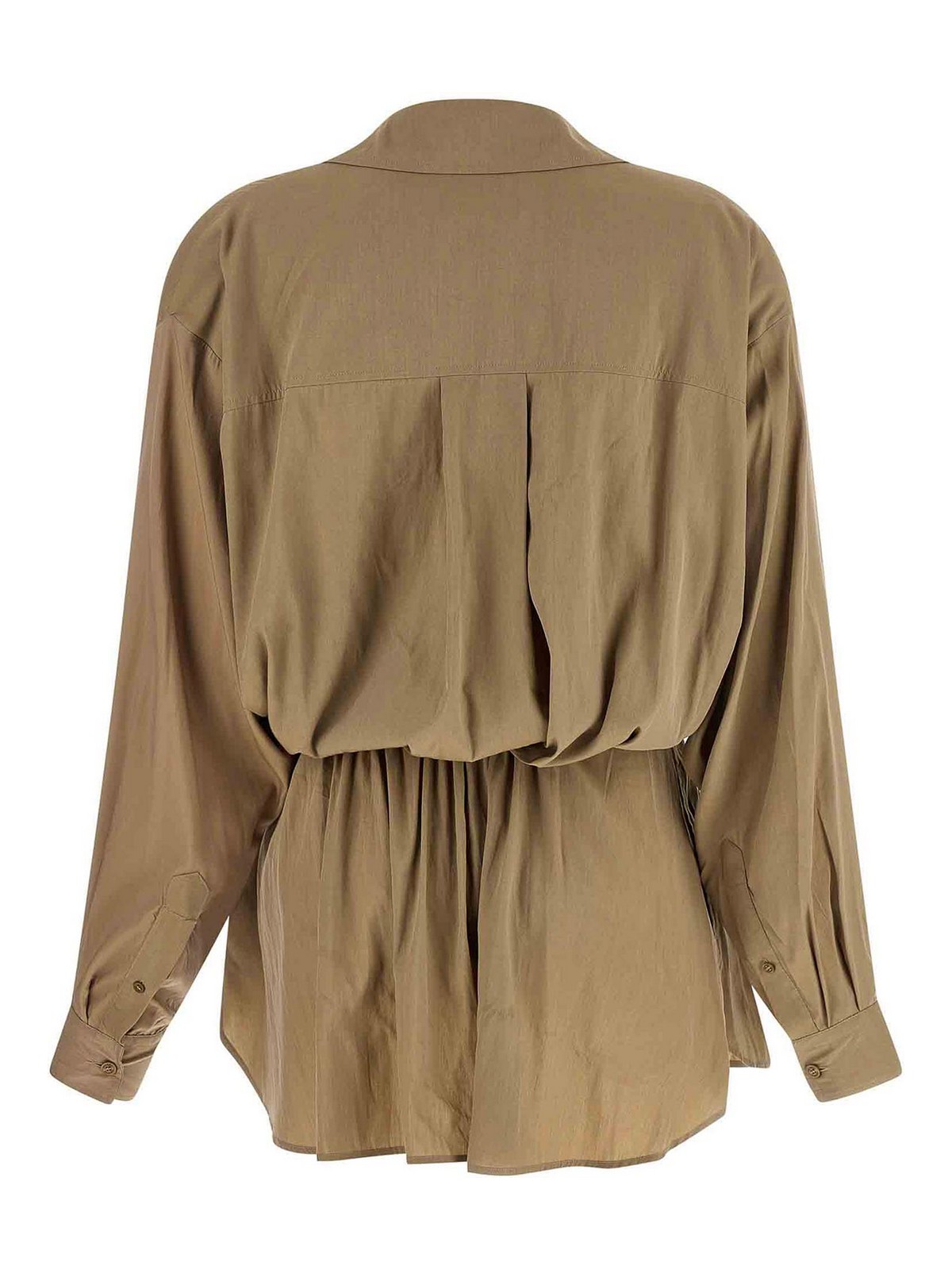 サテンテクニカルファブリック製のケレンブレザー、フロントクロスレース付きウォレットシャツモデル、Vネック、カフスとドロップショルダー付きロングスリーブ、バックゴムウエストバンド。