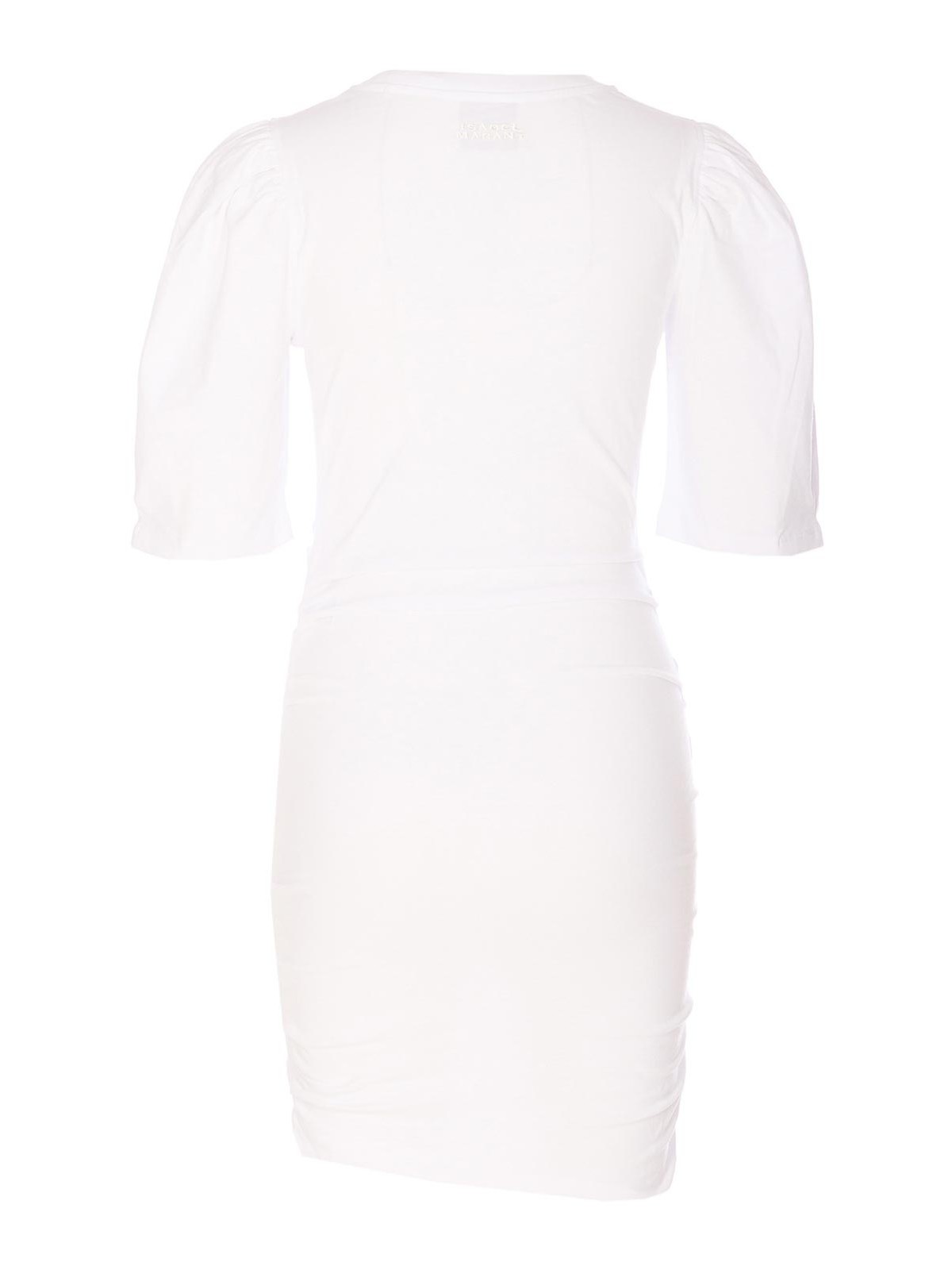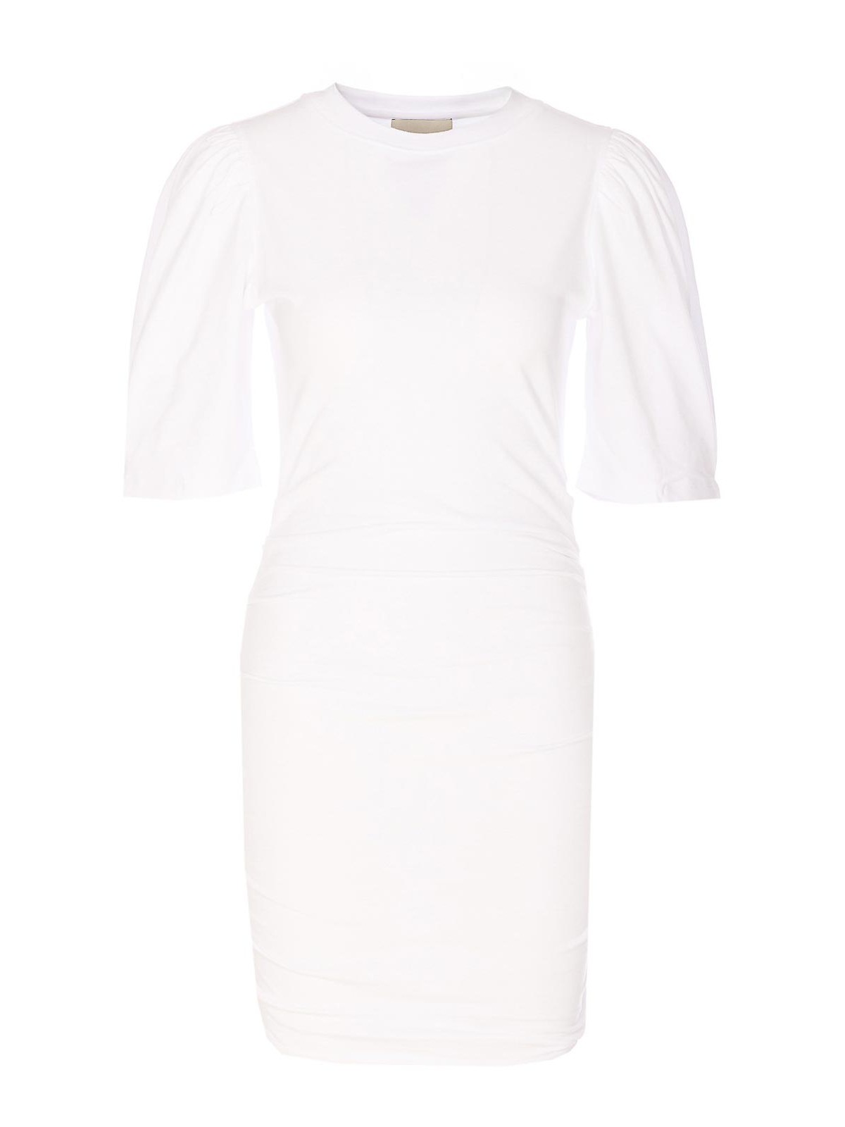 Isabel marant etoile ホワイトミルダドレス、クルーネック、バルーンショートスリーブ、フリル、伸縮性のあるタイトフィット、ミニモデル