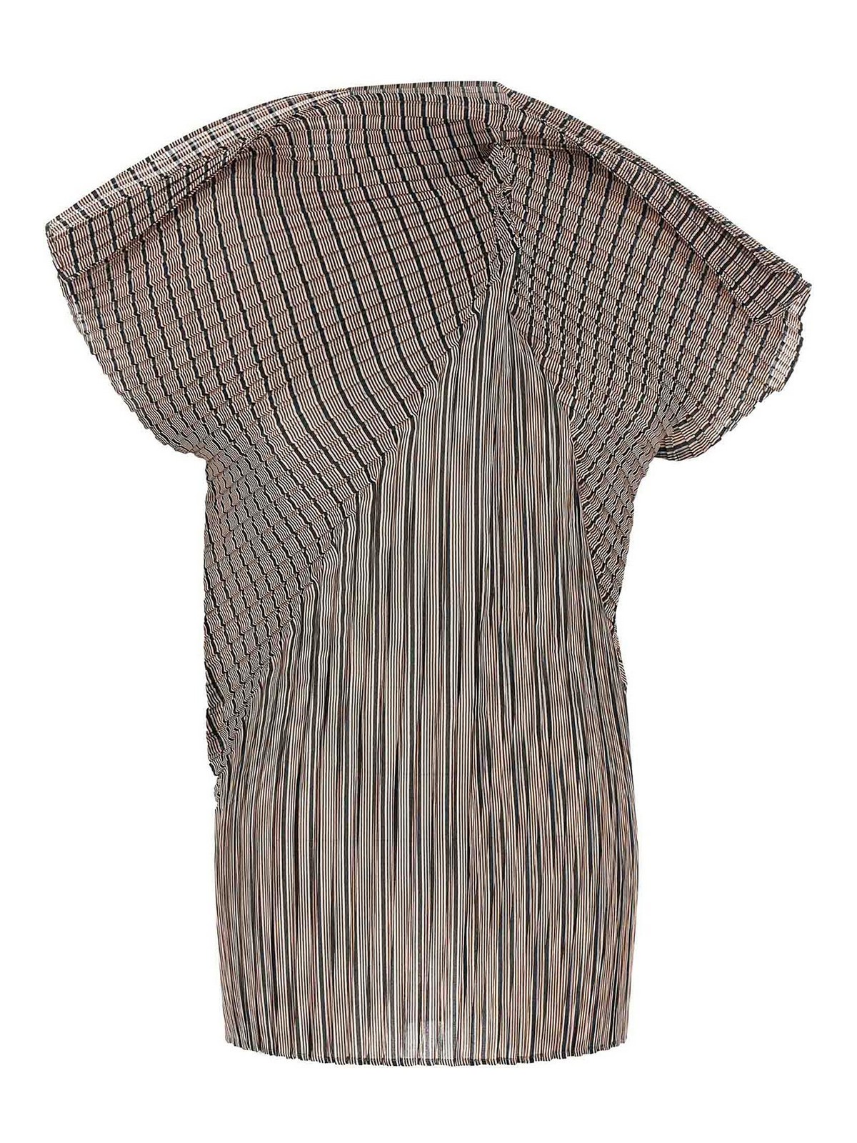 ストライプモワール効果のある半透明のプリーツ生地を使用したジェネリックストライプ(マシンプリーツ)のトップス、ハイネック、ショートスリーブ、彫刻的なデザイン。