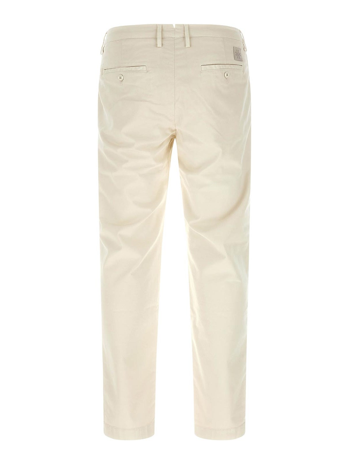 ボビーコットン混紡チノパンツ、ローウエスト、ストレートレッグ、ポケット、フロントジッパーとボタンクロージャー、バックロゴパッチ。