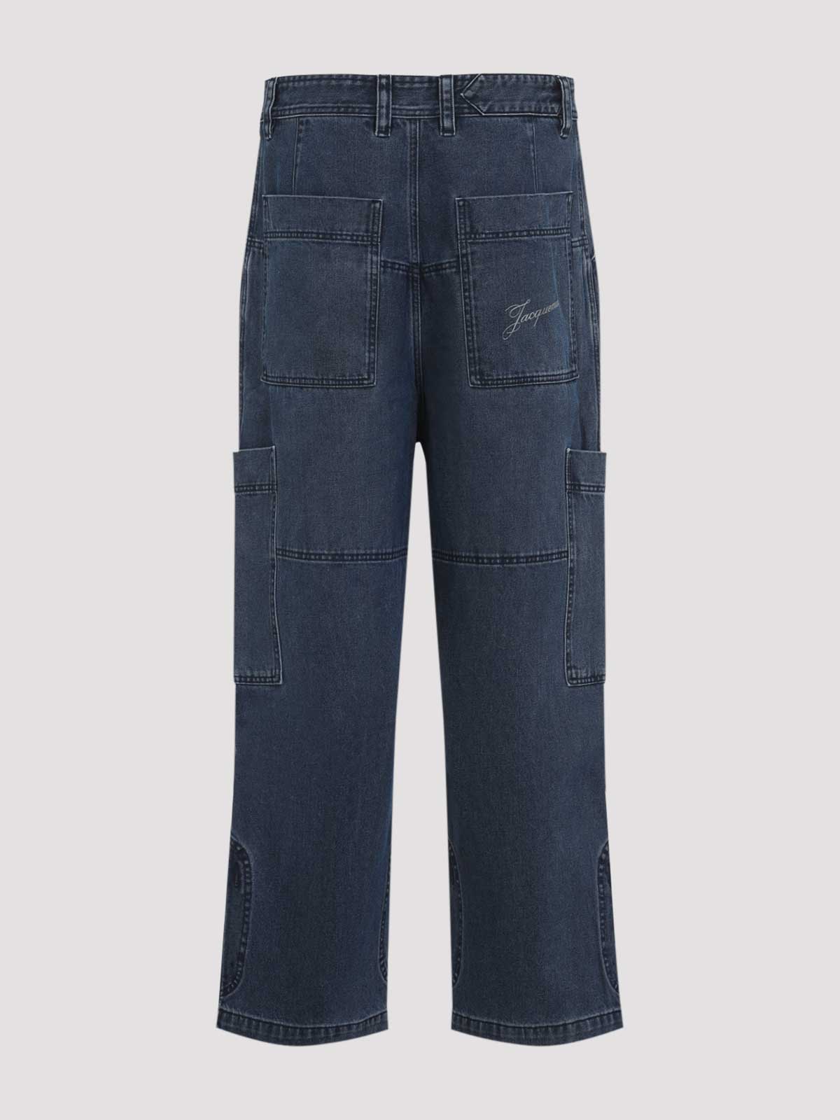 Jacquemus ネイビーブルーコットンルカーゴデニムカレジーンズ。ピュアネイビーブルージーンズ、フロントコンシールファスナー、フロントボタン留め、フロントボタン留め、ベルトループ、サイドポケット、バックポケット、バックレタリングロゴ、脚にカーゴポケット、ワイドレッグ、ストレートヘム。