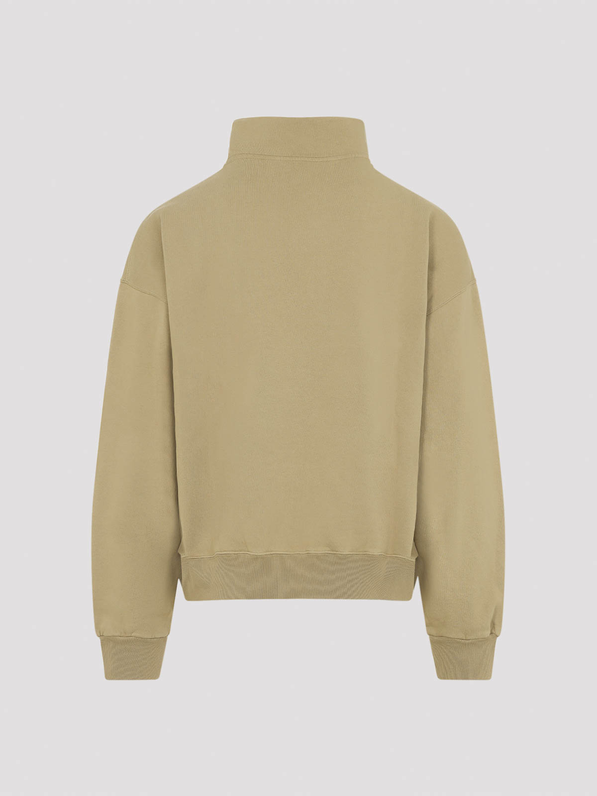 Jacquemus グロスグレインベージュコットンスウェットシャツ。ダークベージュのコットンフリース製で、ハーフジッパー付きのスタンドカラー、胸にグロスグレインのロゴラベル、ドロップショルダー、長袖、リブ編みの袖口と裾、リラックスフィットが特徴です。
