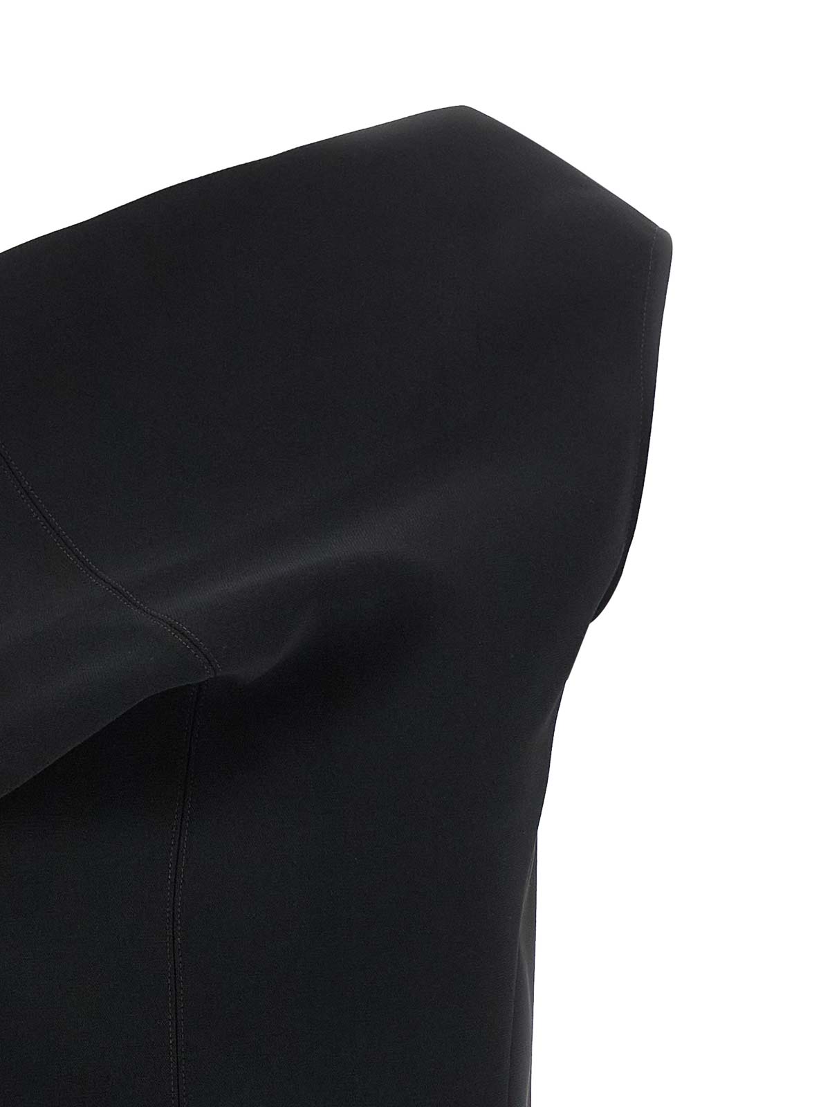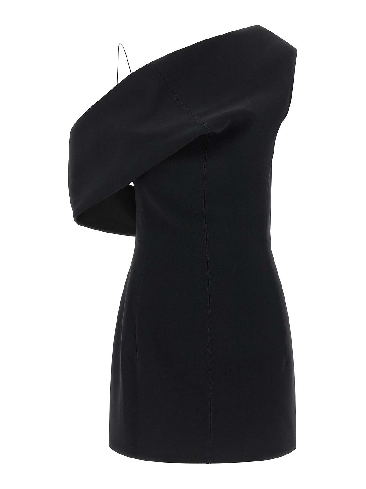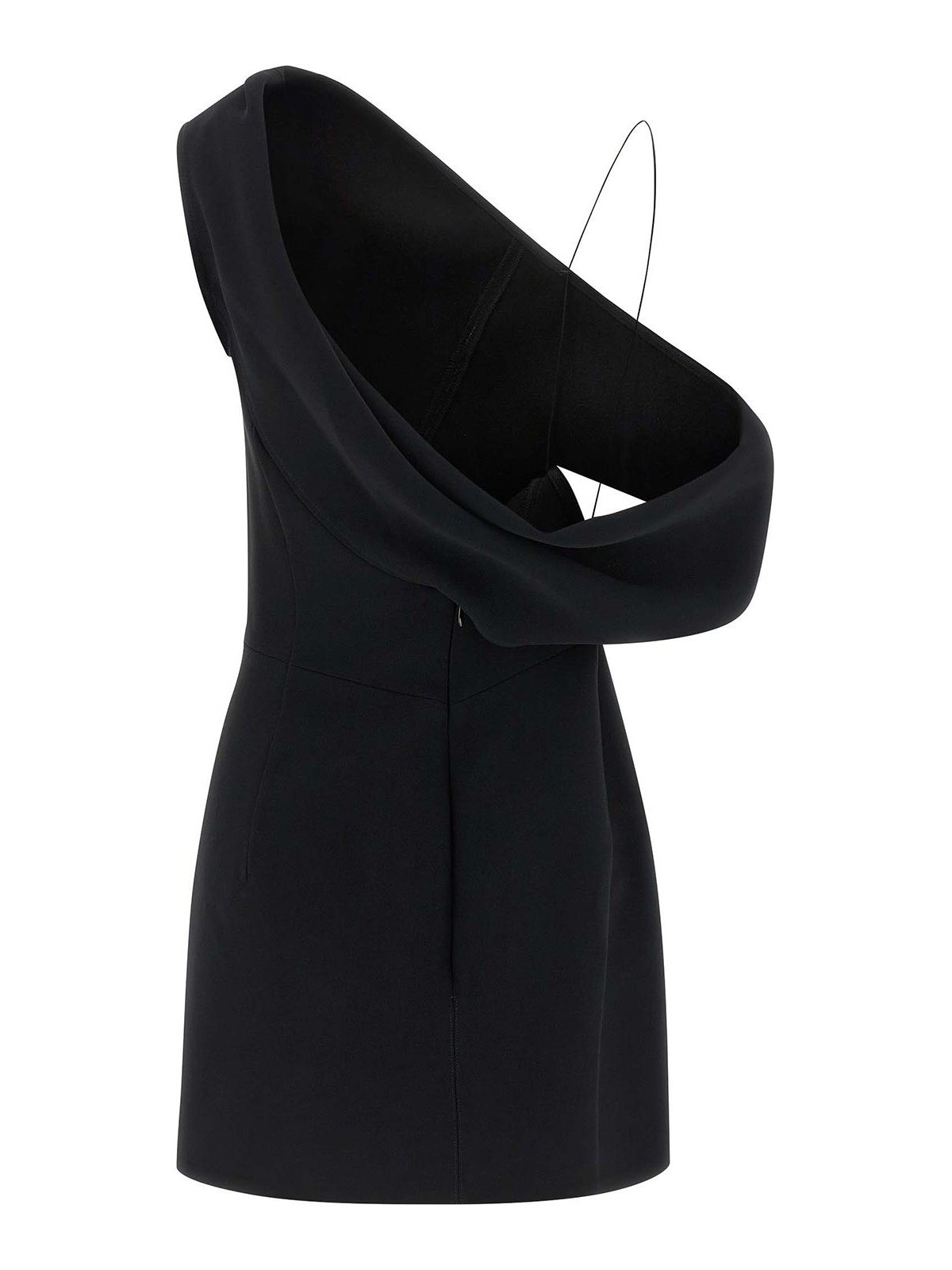 la robe pesce courteのビスコースミニドレス、ドレープネックライン、サイドクロージャー、隠しジッパー付き、アシンメトリーなノースリーブスタイル。