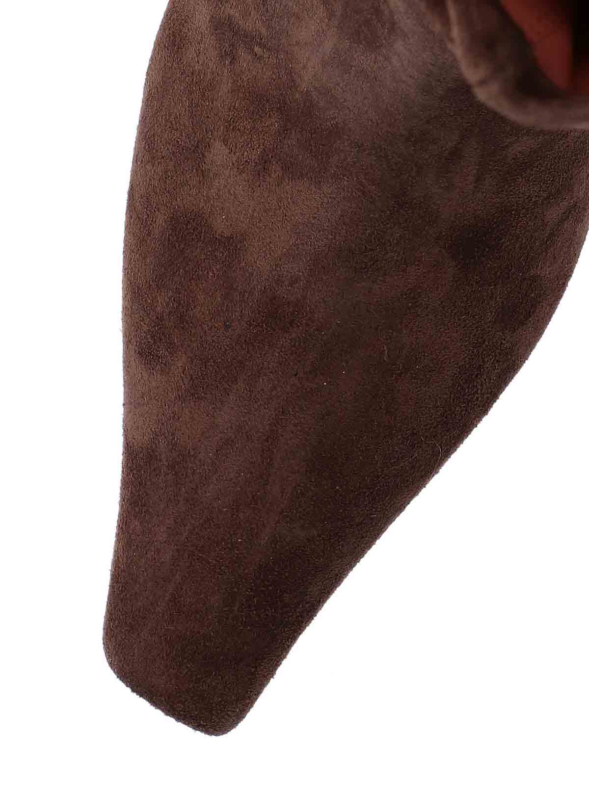 Amina muaddi jamie アンクルブーツ、ブラウンスエード、ダークシェード、カールデザイン、ポインテッドトゥ、スリッポンフィット、ラバーソール。