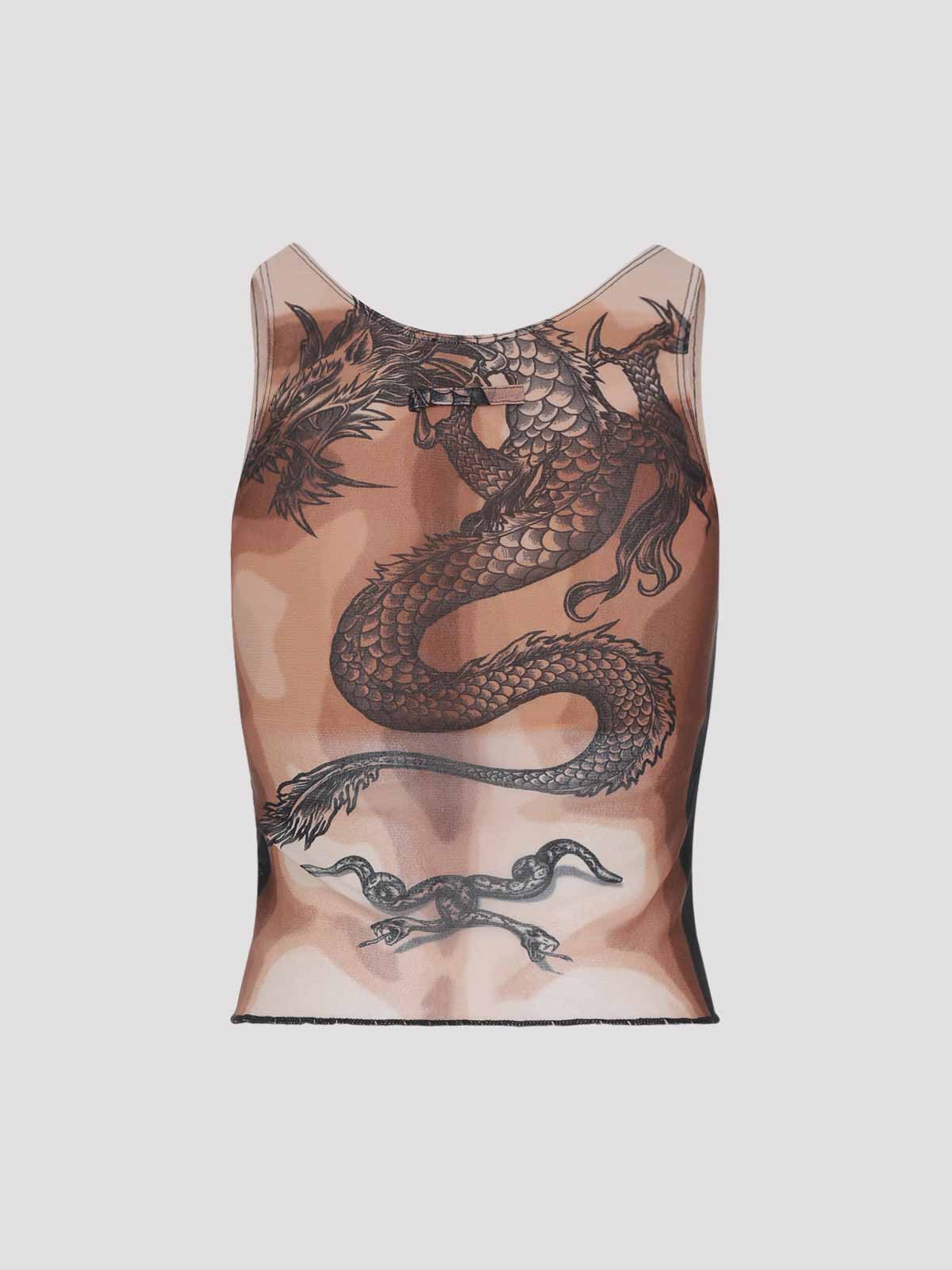 ジャンポールゴルチエセーフセックスタトゥーブラウンポリアミドトップ。ブラウンメッシュ製で、全体にシグネチャーグラフィックプリント、ラウンドネック、ノースリーブ構造、ストレートヘムが特徴です。