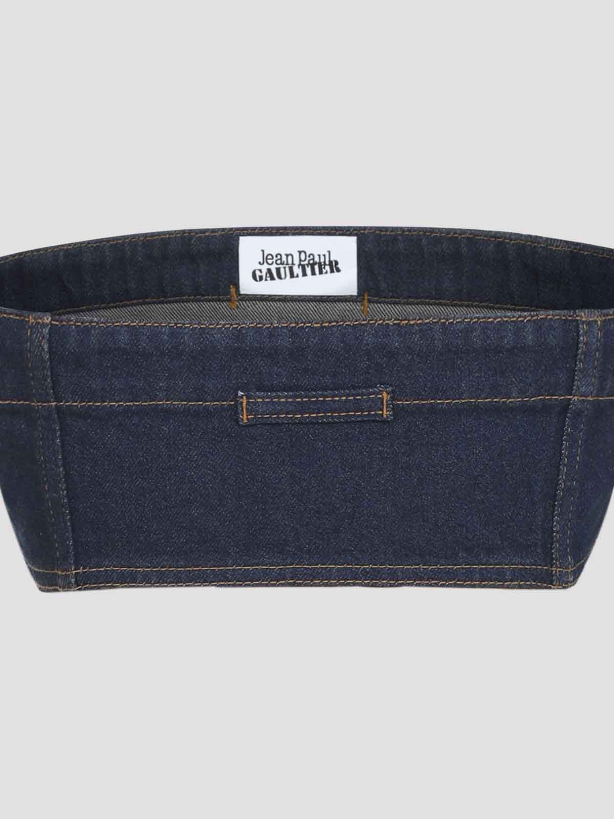 ジャン・ポール・ゴルチエのブルーデニムブラトップ。ブルーのコットンデニム製で、ショルダーレス構造、ストレートネックライン、ボタン付きフロントフラップ2つ、フロントボタン留め、クロップ丈が誇張されているのが特徴です。