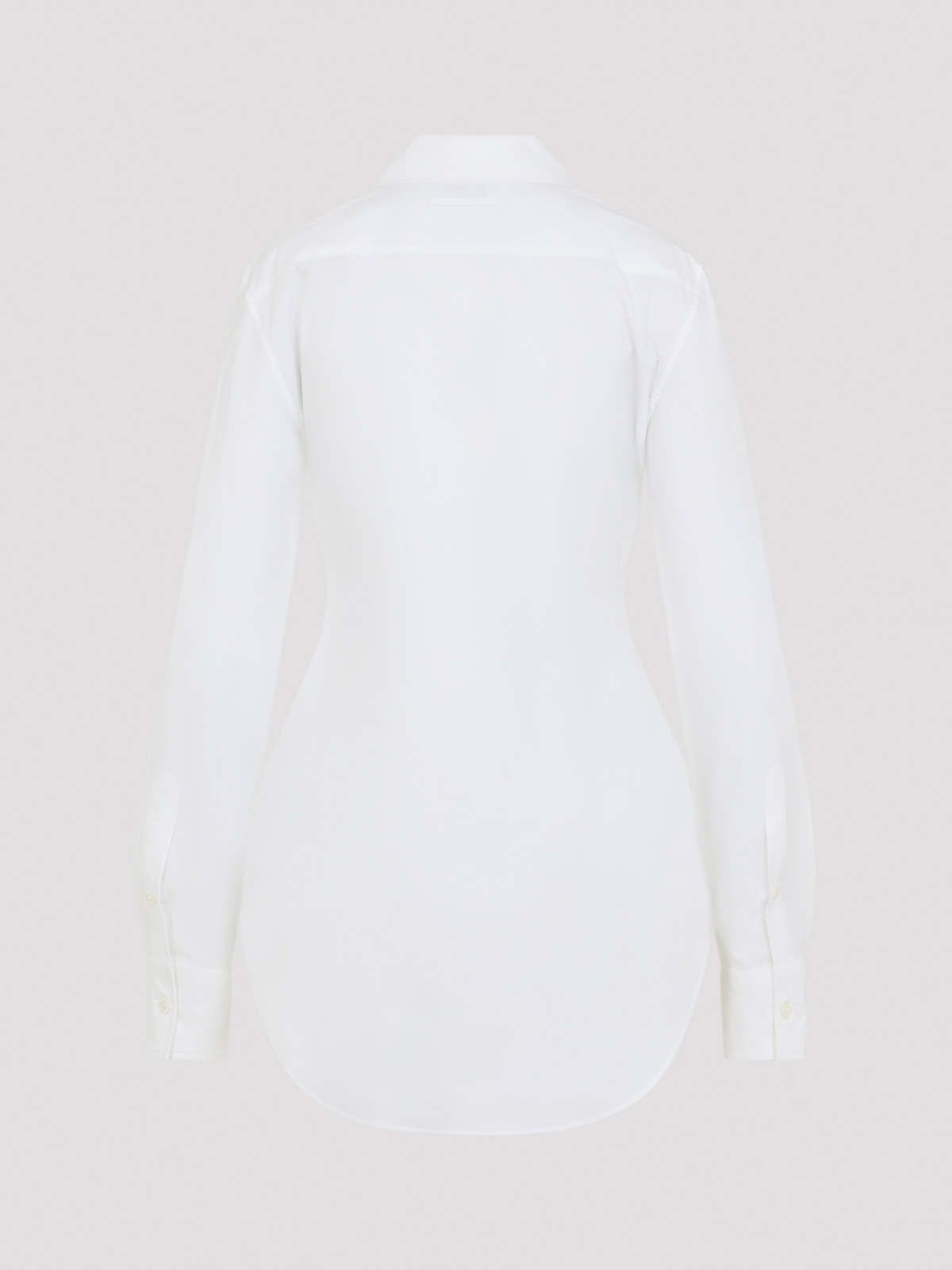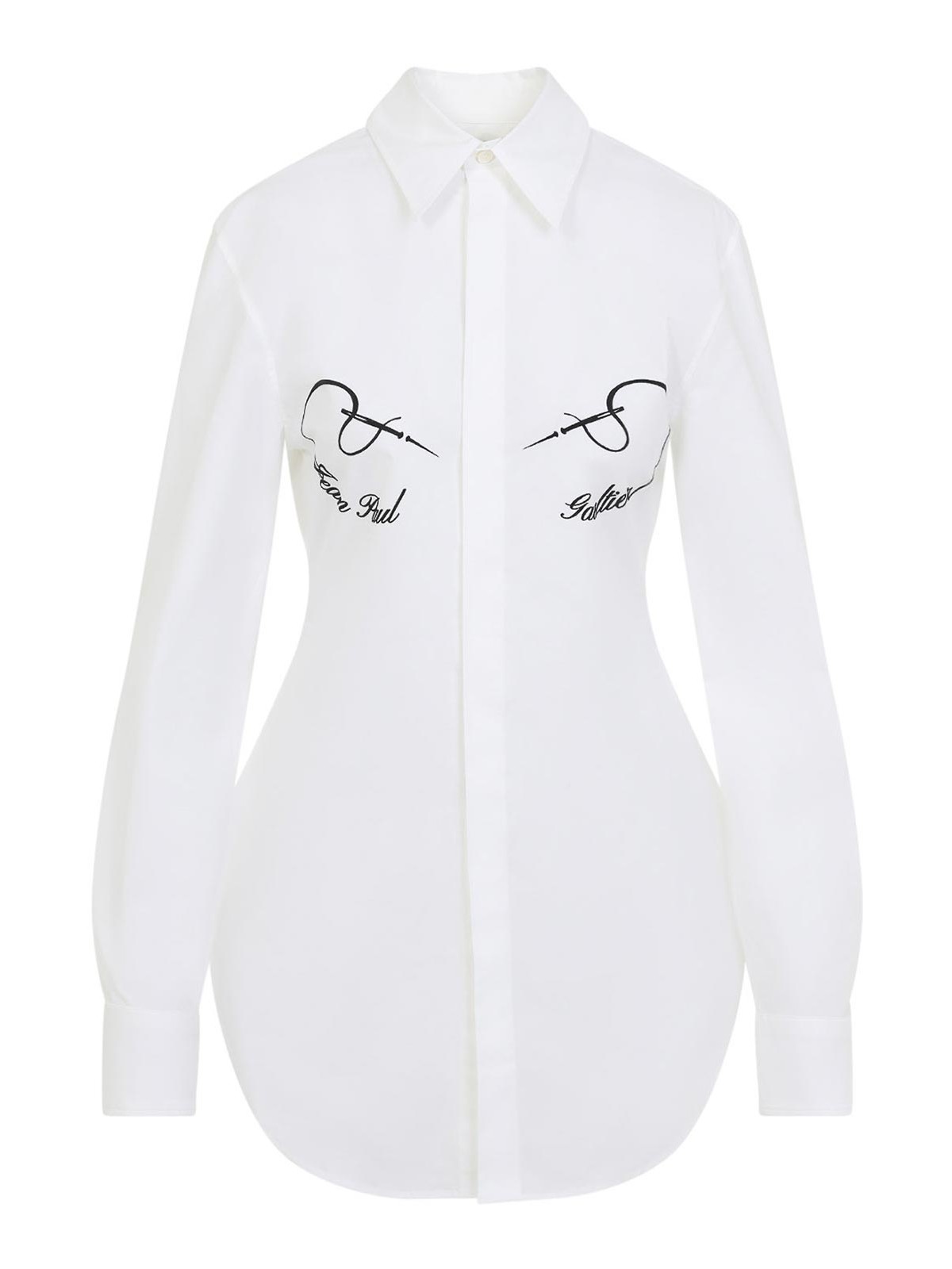 ジャンポールゴルチエニードレスフロックホワイトコットンシャツ。白いストレッチコットン製で、先のとがった襟、フロントボタン留め、胸に黒いフロック加工のロゴとグラフィック、ボタン付きカフス付きの長袖、バックヨーク、丸い裾が特徴です。