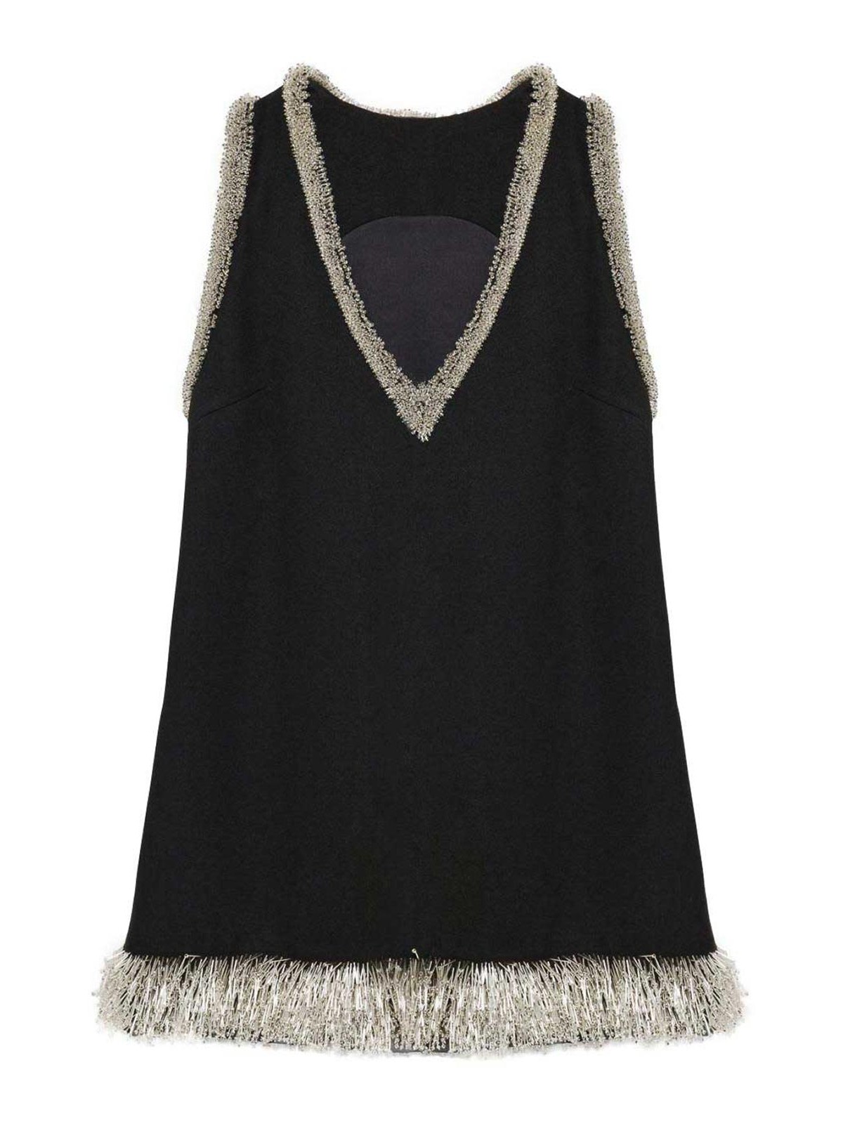 デザイナーカラー:ブラック、ポリエステルブレンド、ノースリーブ、サイドファスナー、装飾ディテール、Vネック、裏地付き。