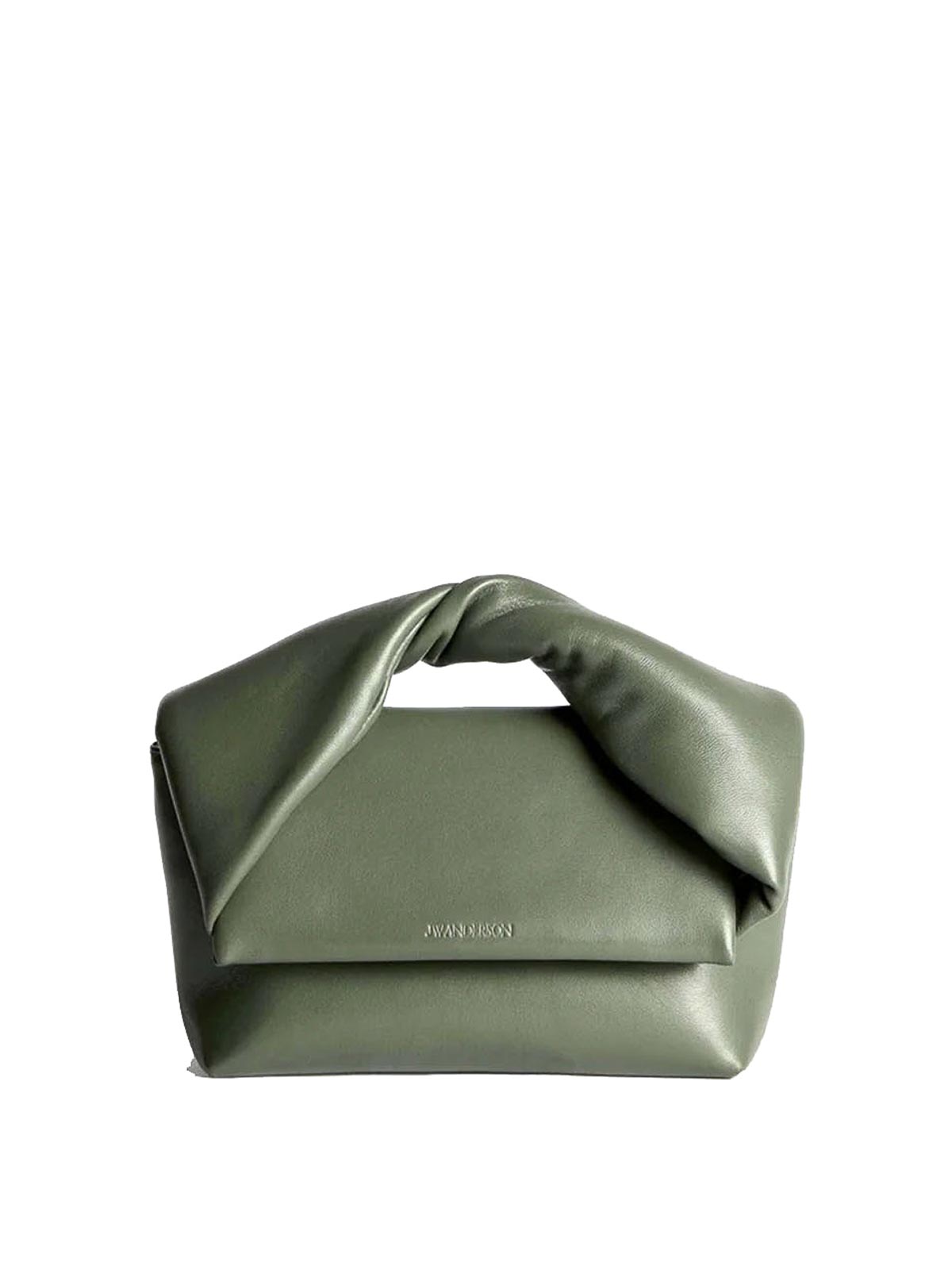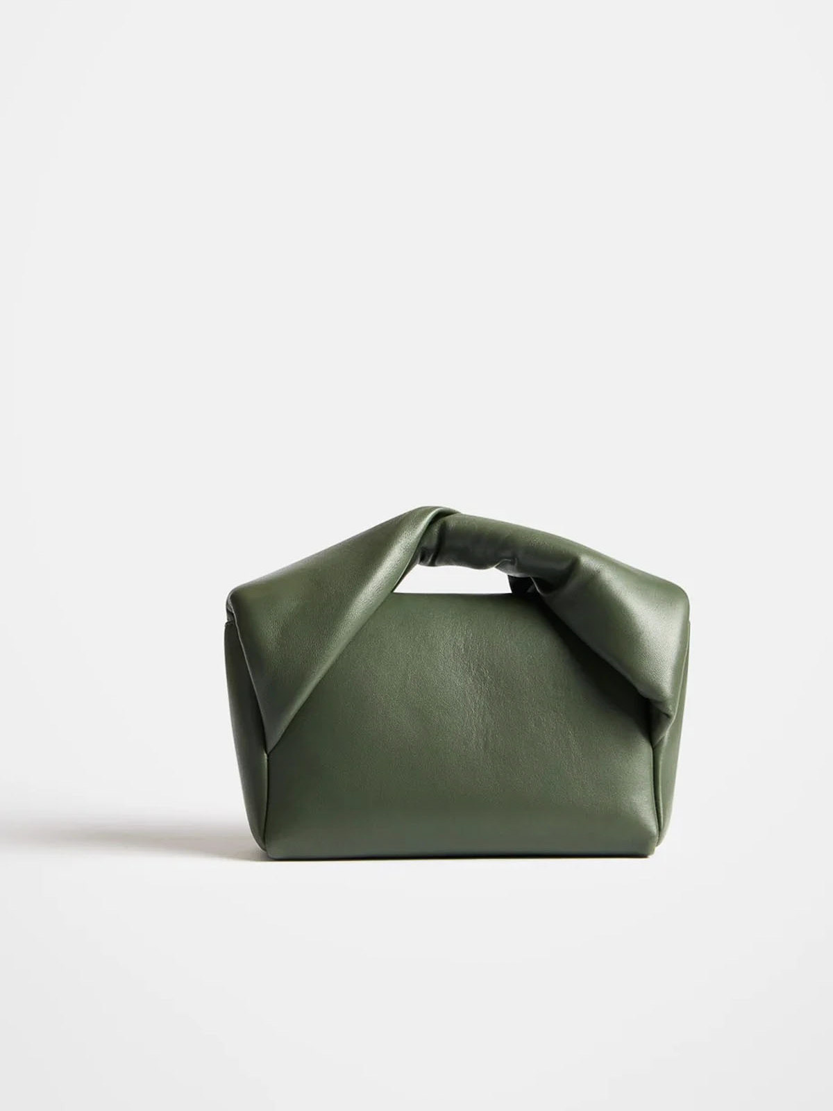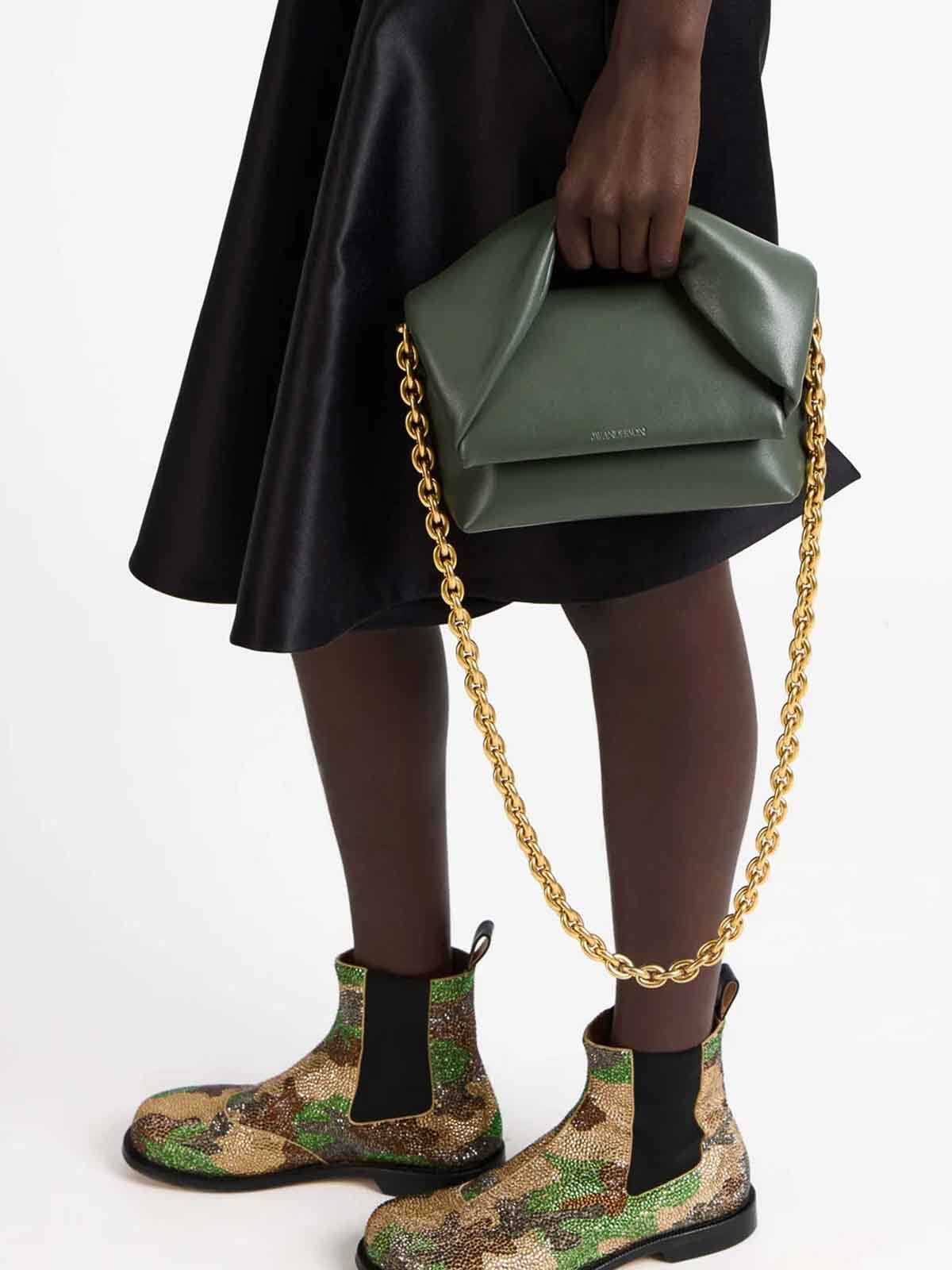 柔らかいカーキ色のナッパレザーを使用したミディアムツイスターバッグ。短い編み込みボウハンドルと、アンティークゴールド仕上げのチェーンが付いた取り外し可能なショルダーストラップが特徴です。マグネットフラップクロージャーとゴールドトーンのエンボス加工のロゴとディテールも特徴です。
