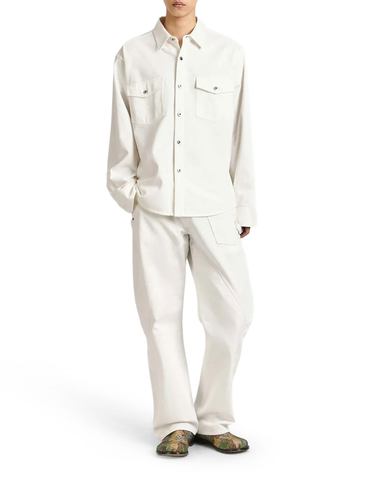 クラシックカラー、ロゴが刻印された金属製のスナップボタン付きフロントクロージャー、フラップとスナップ付きの胸ポケット2つ、左右非対称のカーブヘム、背面にレザーロゴパッチ、オーバーサイズフィット、100%コットン、モデルはMサイズ、身長189cm、色:白