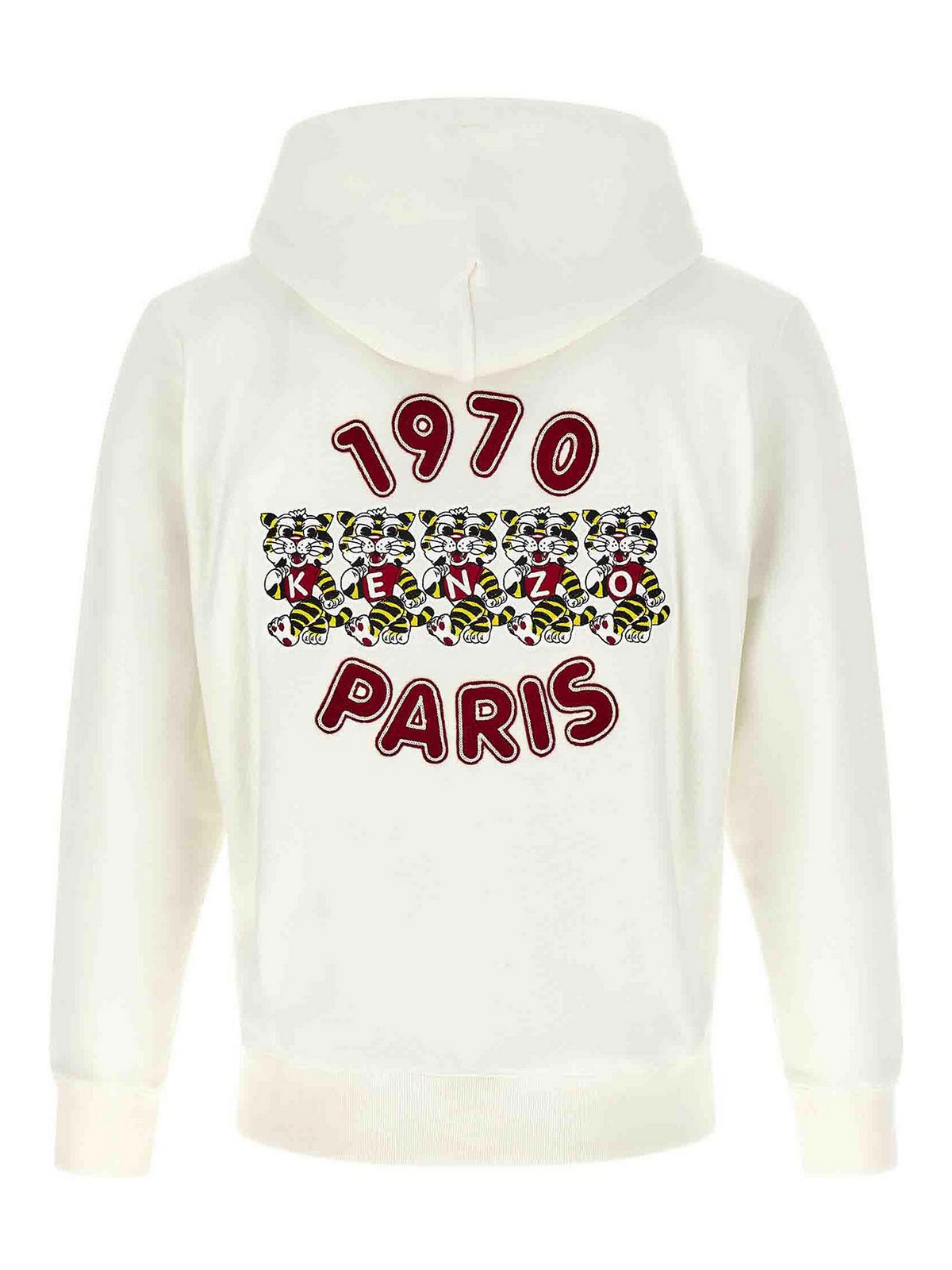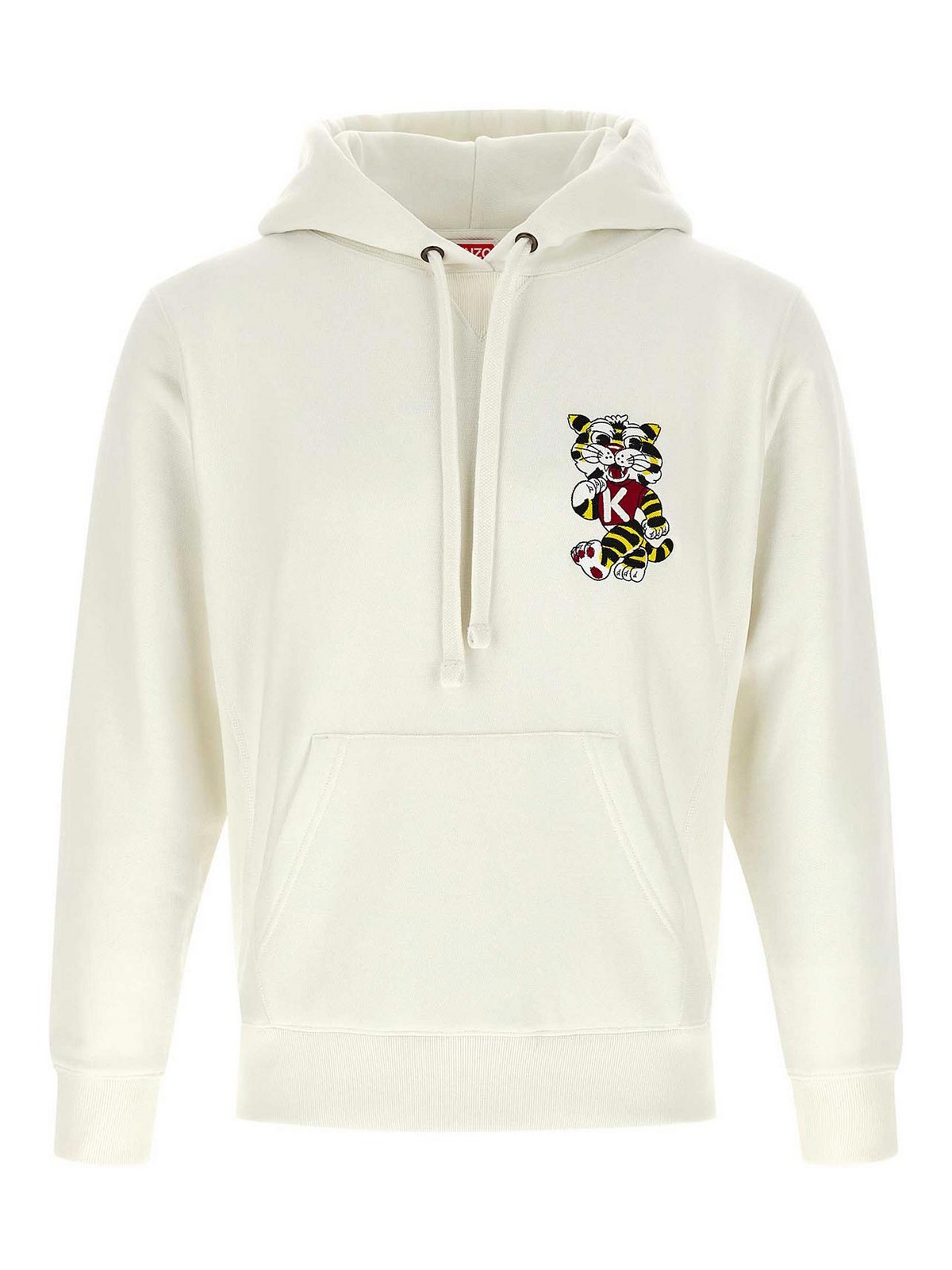 カンガルーポケット付きワイルドタイガーエンブロイダリーパーカー、前面と背面に刺繍、ロングカフスリーブ。