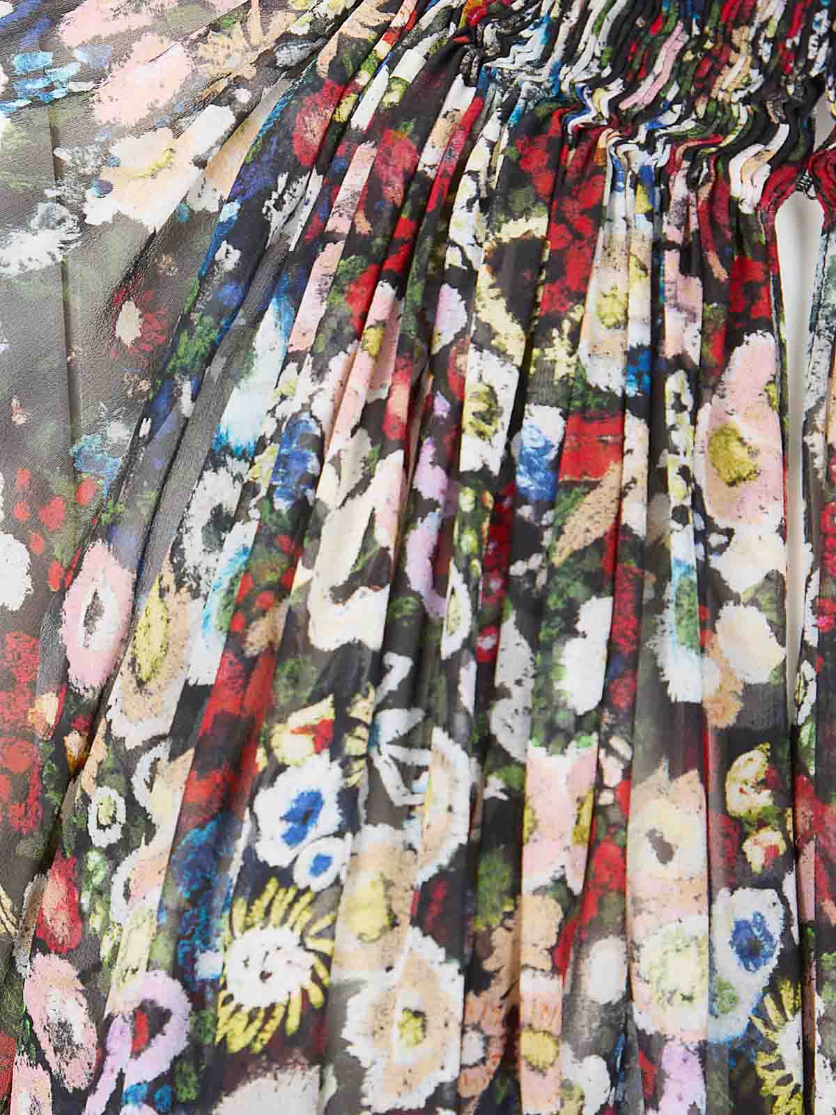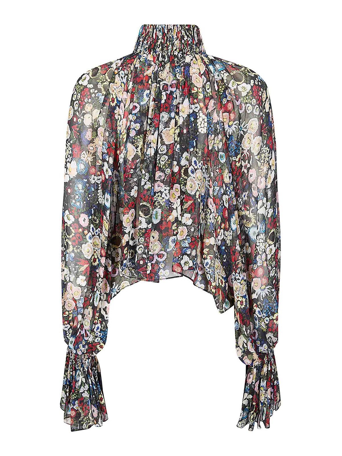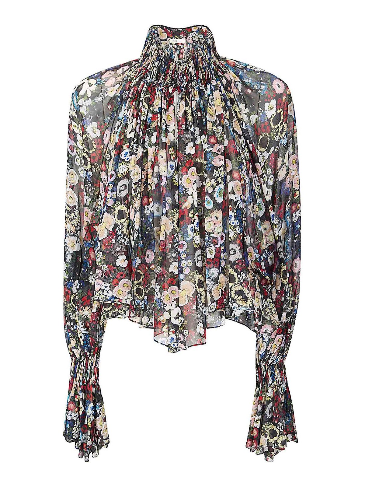 花柄シルクシフォンのハイネックマキシトップ、ロングスリーブ、ライトファブリック、セミシアー、ショートフィット。