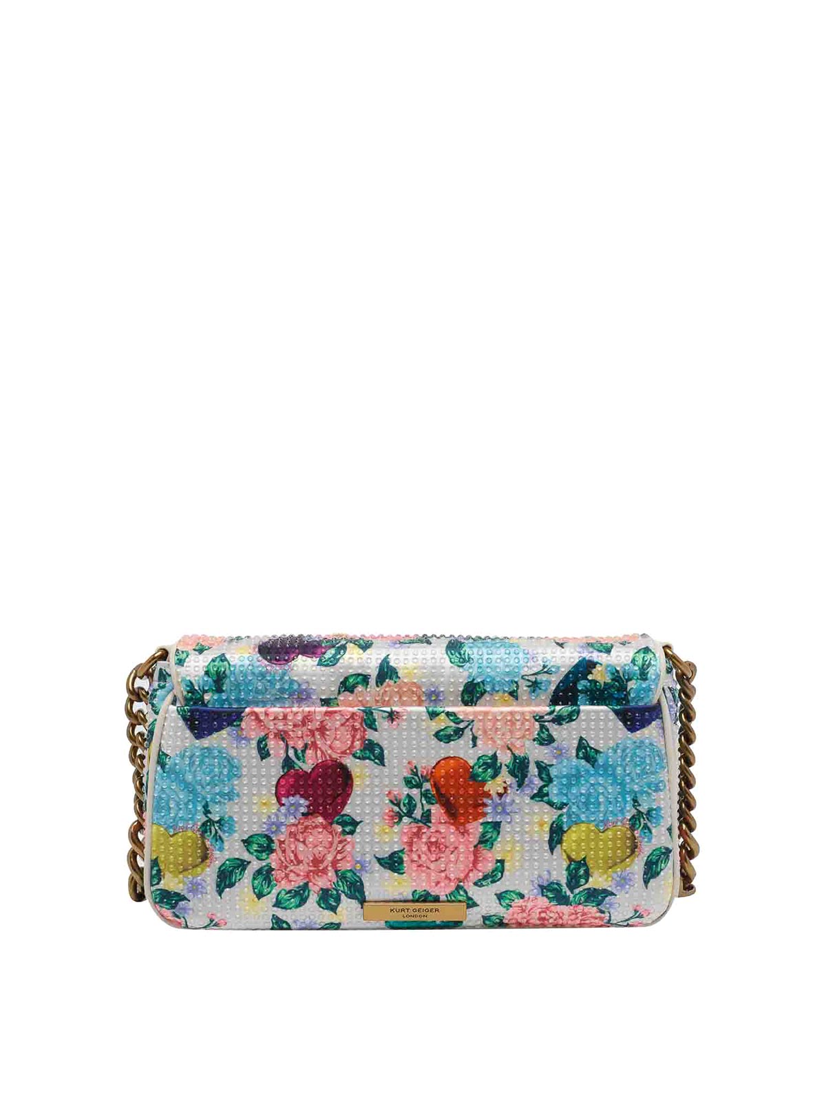 Kurt Geiger マルチカラーケンジントンショルダーバッグ、マグネットクロージャー、内側にファスナーポケット、外側にオープンポケット、チェーンショルダーストラップ、フラワーパッチ