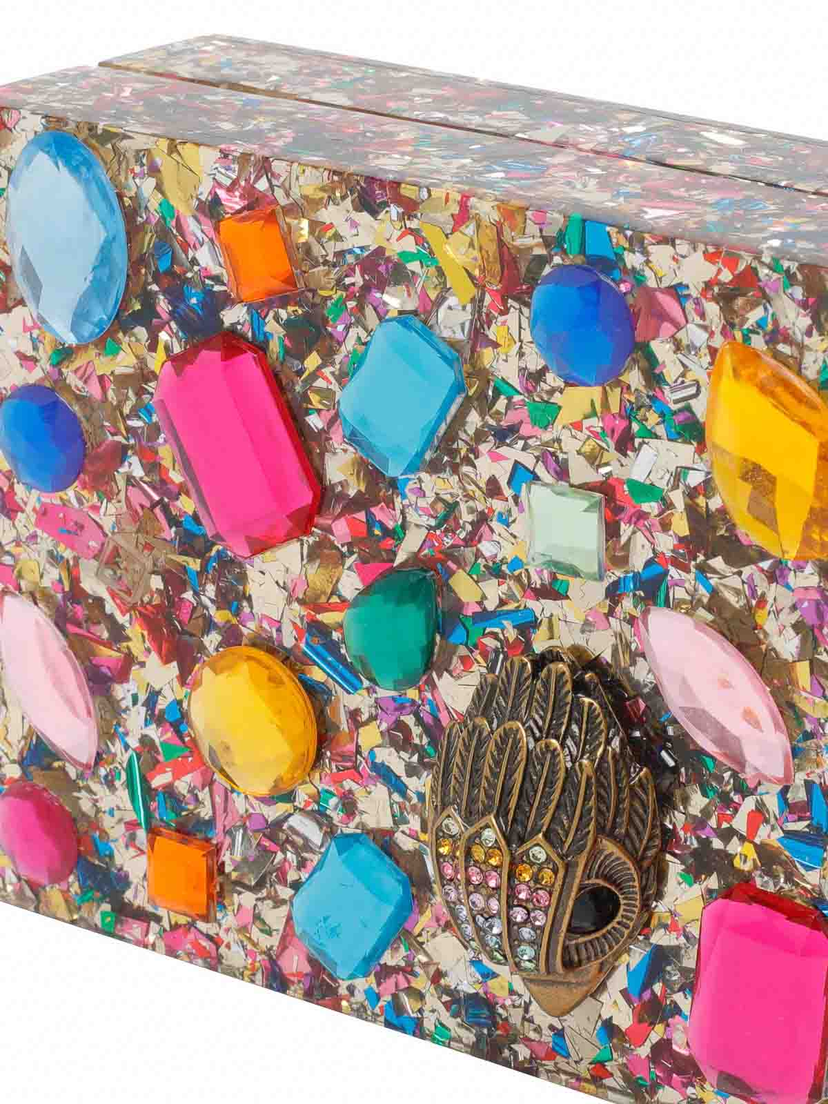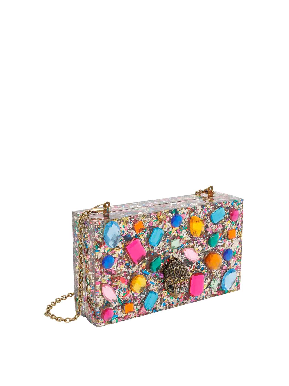 Kurt Geiger マルチカラークリスタルボックスクラッチ、マグネットクロージャー、取り外し可能なチェーンストラップ、全面にクリスタル