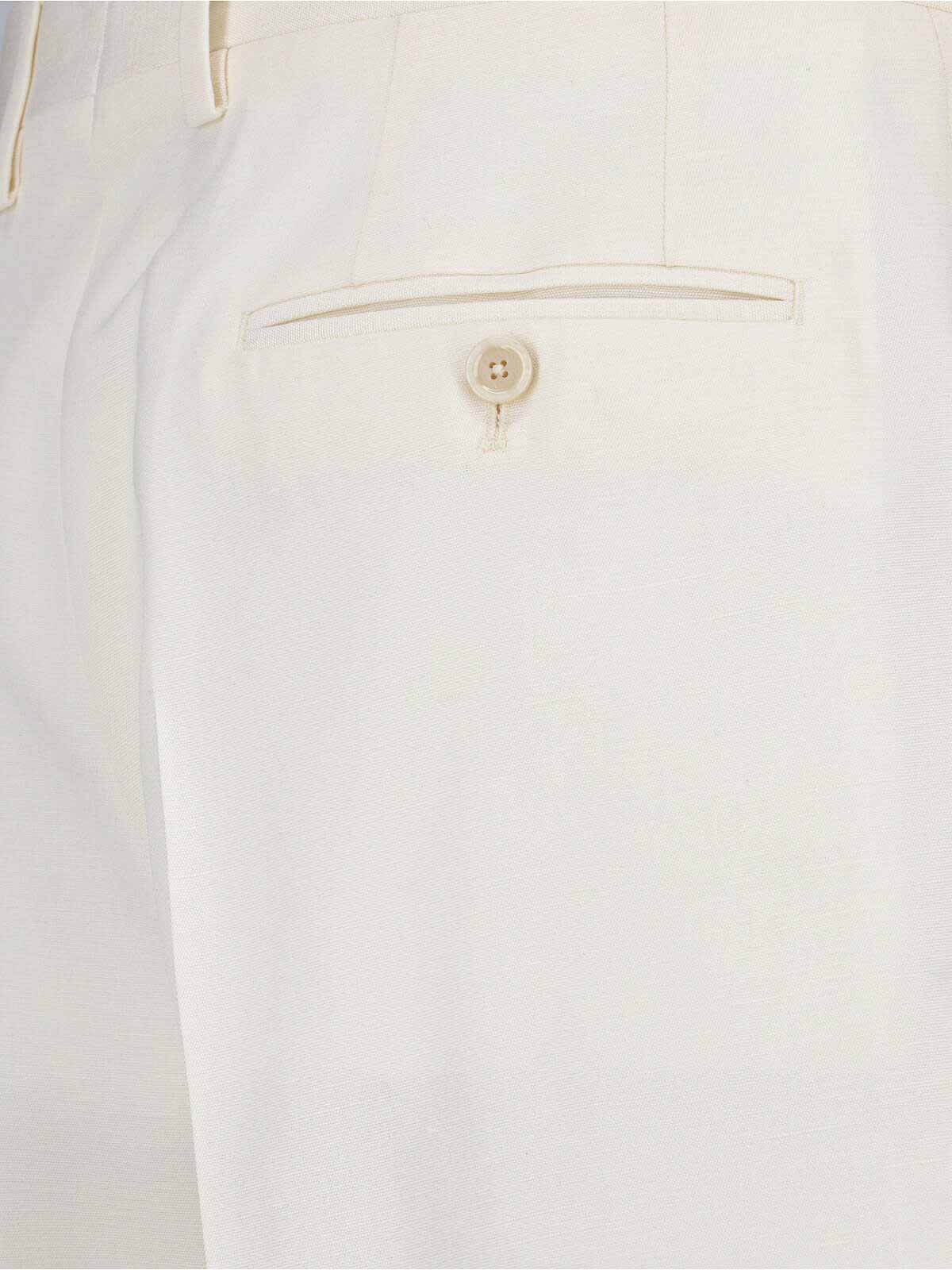 ラルディーニテーラードパンツ、ホワイトビスコース製、ミディアムウエスト、フロントジッパーとフッククロージャー、ベルトループ、サイドスラントポケット2つ、バックボタン付きウェルトポケット2つ、フロントダーツ、ストレートレッグ。