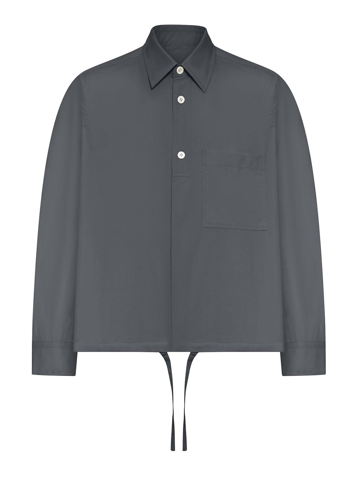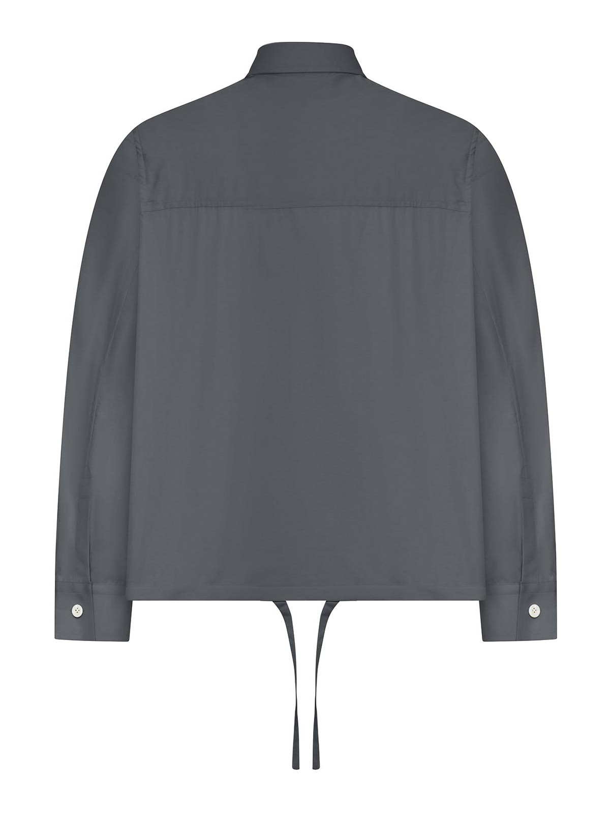クラシックなストラクチャードカラー、部分的にボタンをあしらったフロントクロージャー、トーン・オン・トーン・ボタン、ボタン付きカフス付きロングスリーブ、パッチチェストポケット、水平ステッチのバックヨーク、調節可能なドローストリング付きストレートヘム、レギュラーフィット、シルクとコットンのブレンド、色:グレー