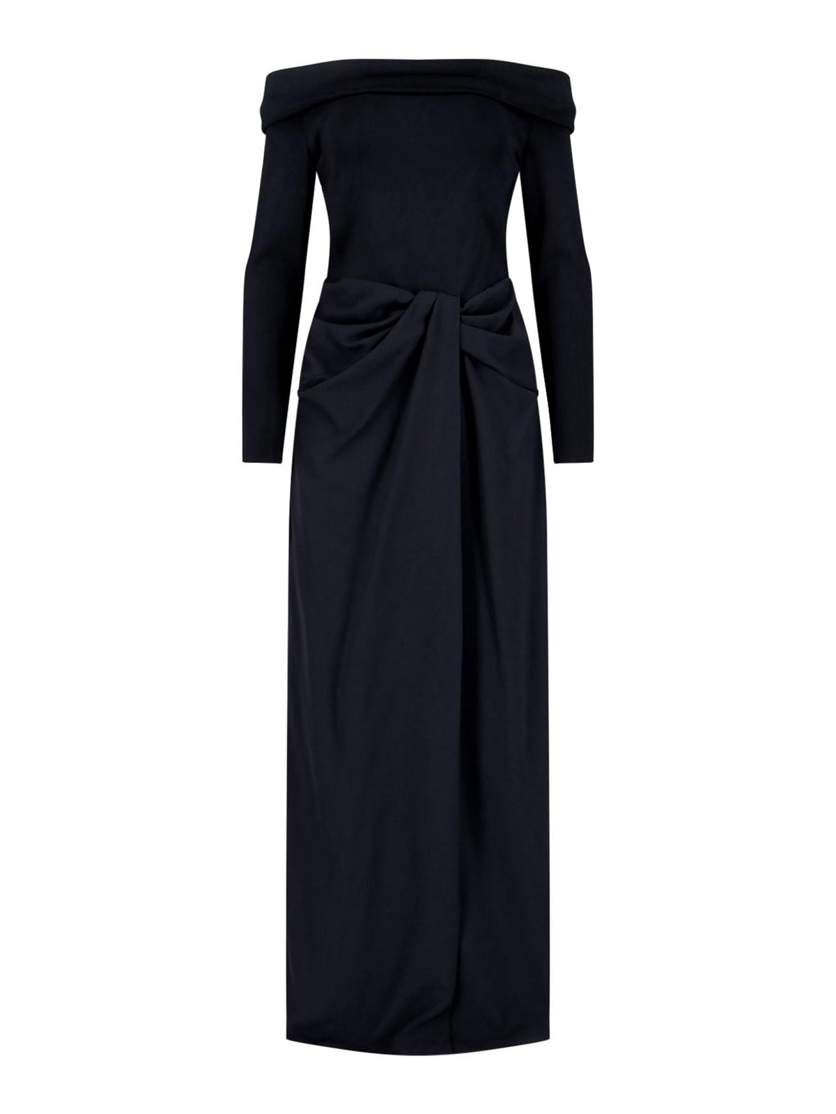 Ralph Lauren ビスコースマキシドレス、ブラック、ロングスリーブ、ストレートネック、リブ編みの仕上がり、サイドジッパー、フロントのドレープディテール、マキシサイドスリット、ストレートヘム。