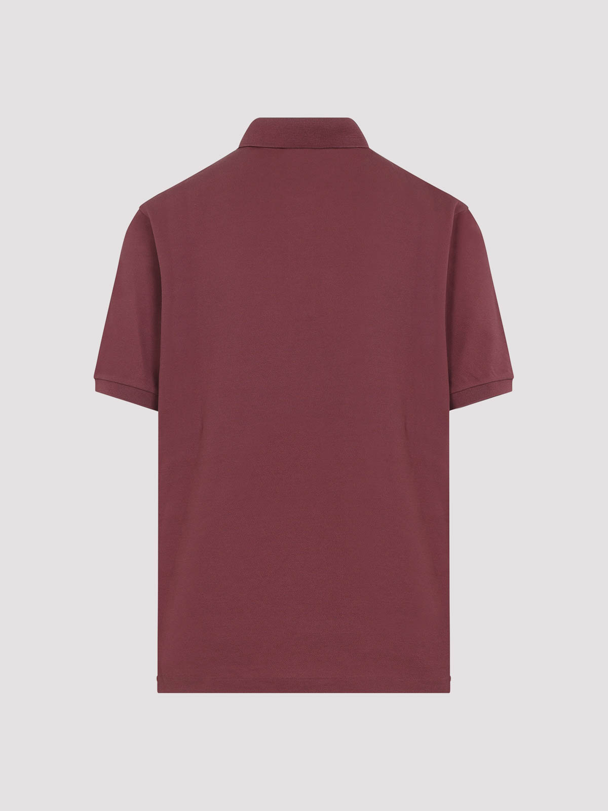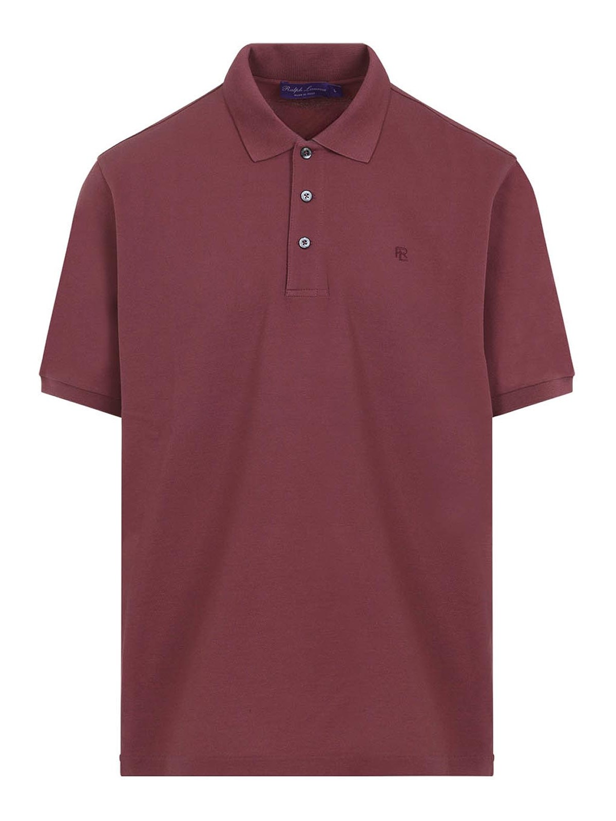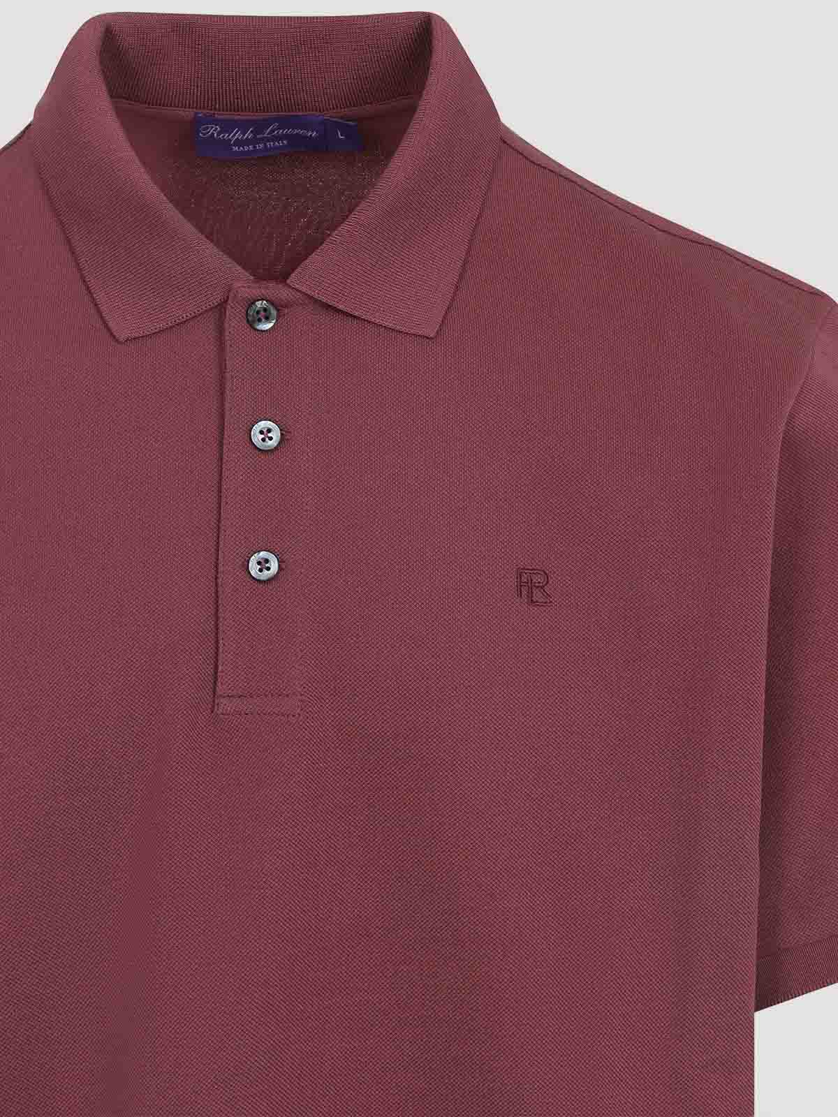 Ralph Lauren パープルレーベルのレッドコットンポロシャツ。ダークレッドのコットンピケで作られたクラシックなポロシャツ。先のとがった襟、前面に3つボタン留め、胸に同系色のロゴ刺繍、リブ編みの袖口が付いた半袖、ストレートヘムが特徴です。