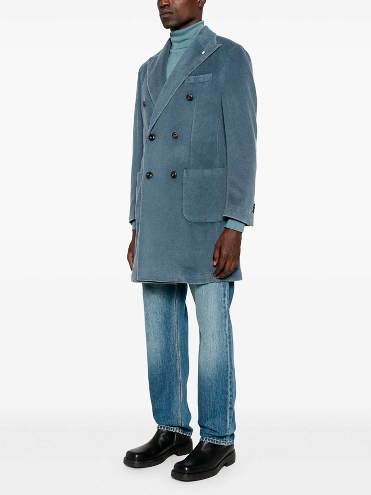 ライトブルー、ダブルブレストクロージャー、パッチポケット、ポインテッドラペル、ロングスリーブ、ストレートヘム