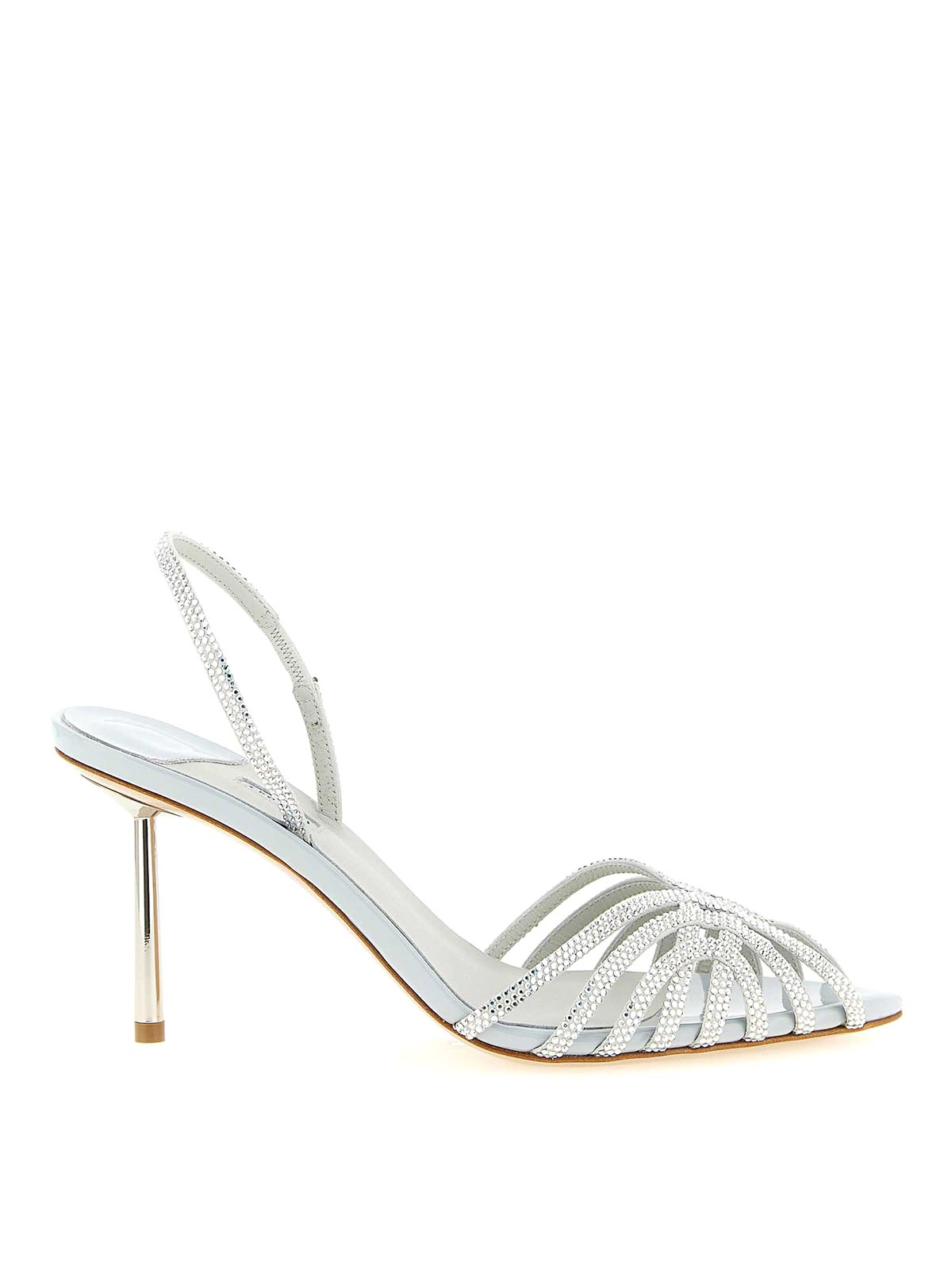 embrace'のパテントレザー製サンダル。全体にラインストーンをあしらいました。ポインテッドトゥ、ゴムストラップ、ヒール、中央に滑りにくいラバーをあしらったレザーソール。