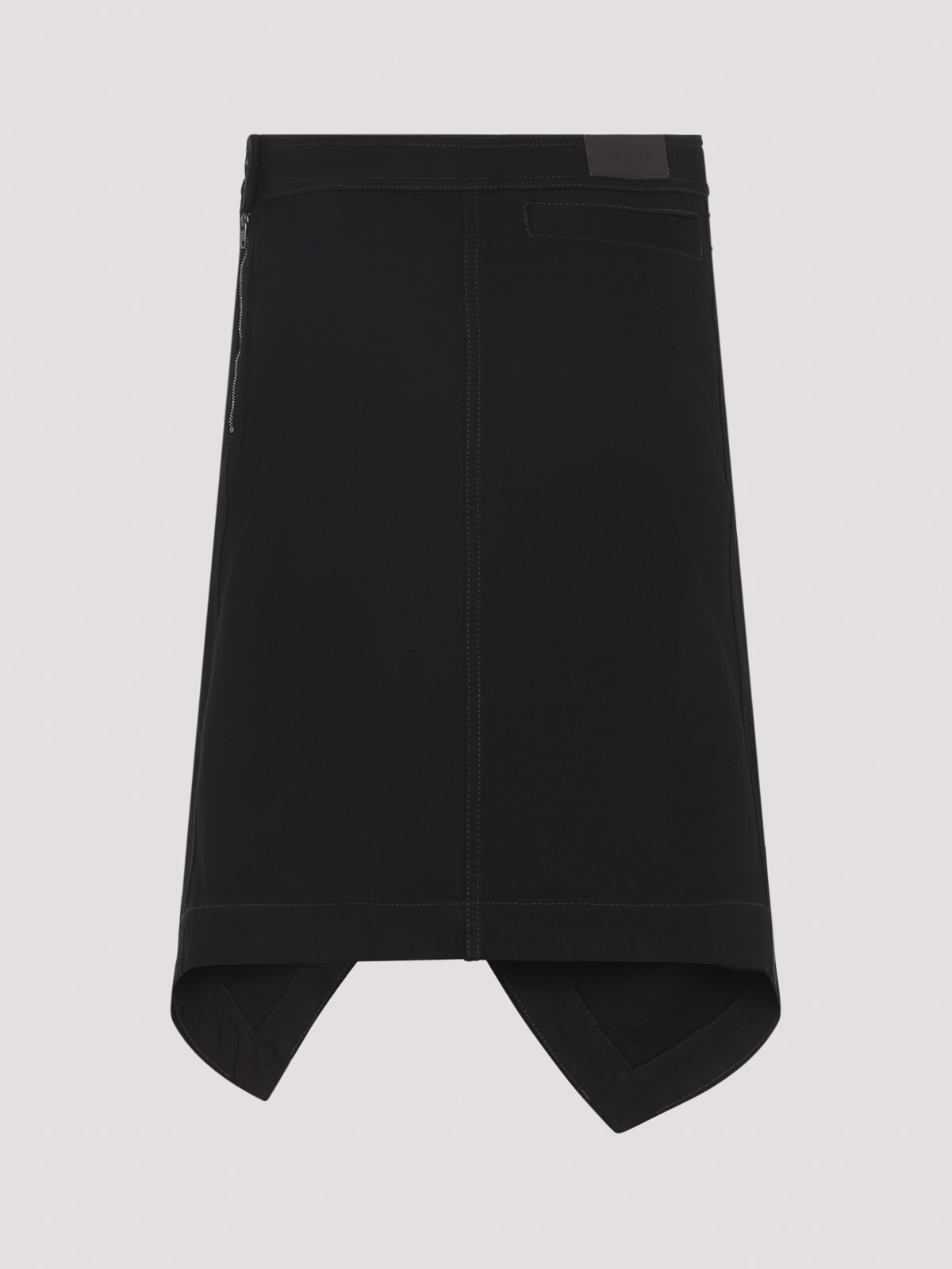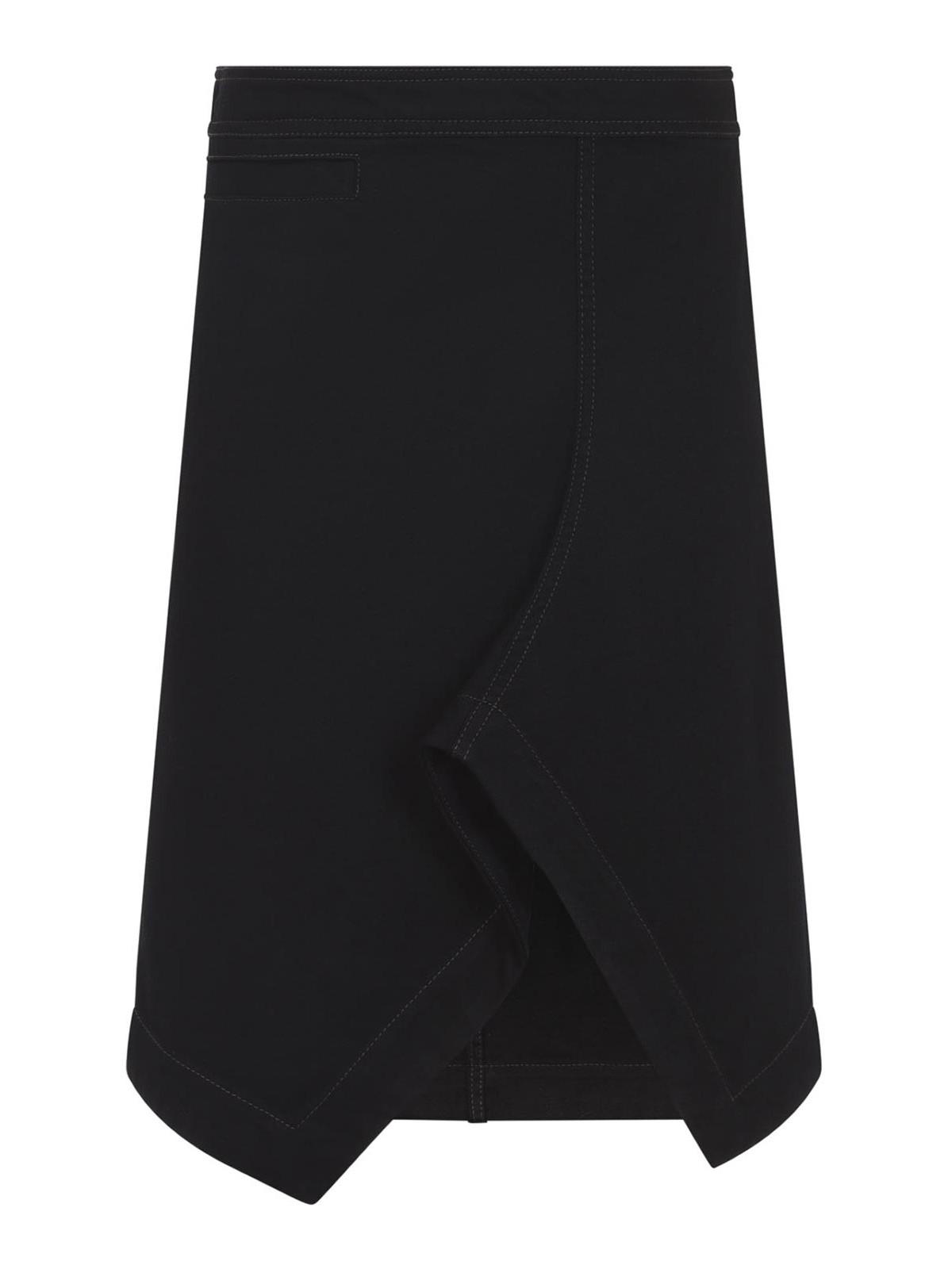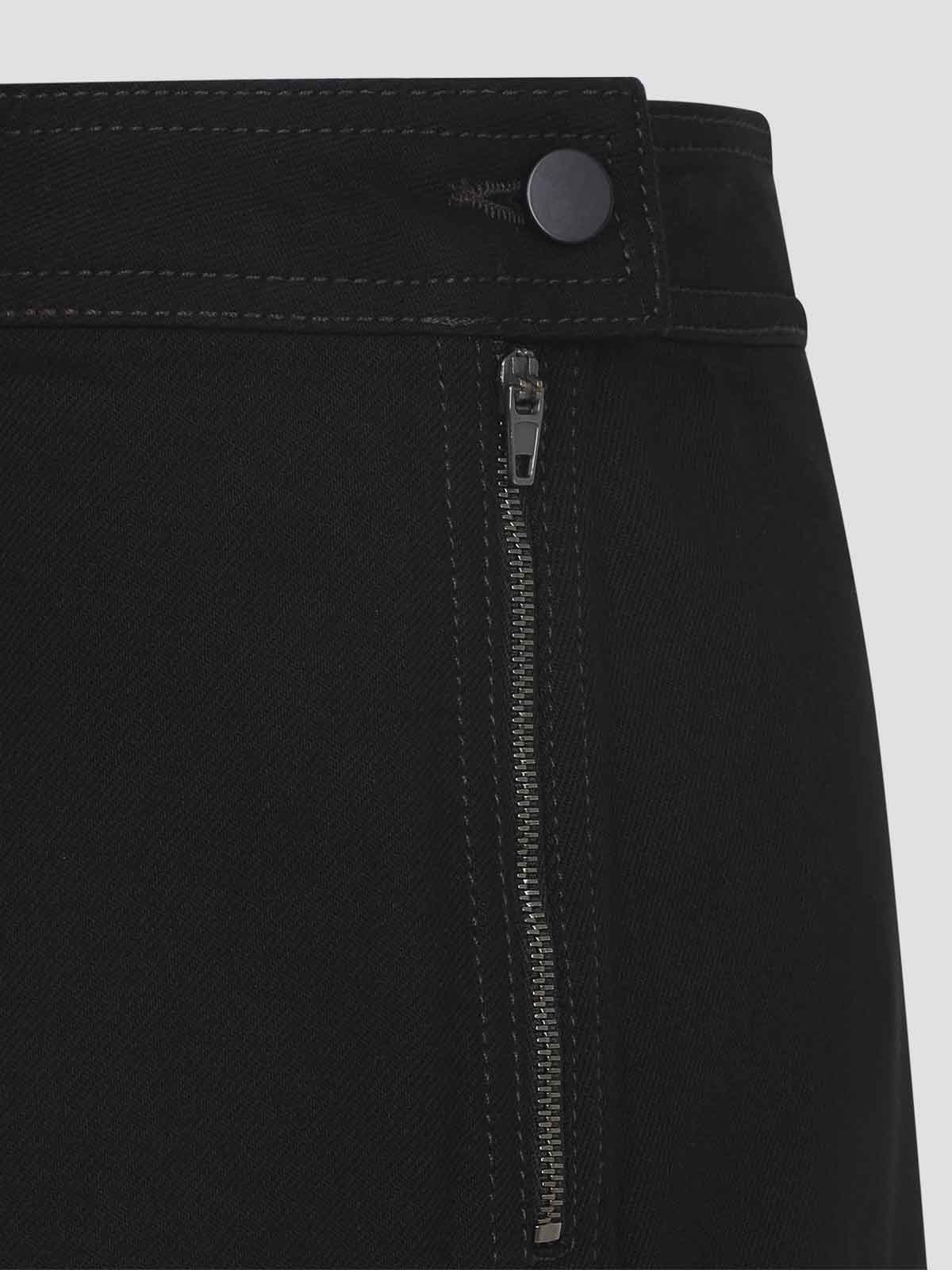 Lemaire アシンメトリーブラックコットンミディスカート。ブラックコットンデニム製で、スリットのディテール、サイドボタンとファスナー、バックにウェルトポケット、バックにブランドラベルをあしらったアシンメトリーな構造が特徴です。
