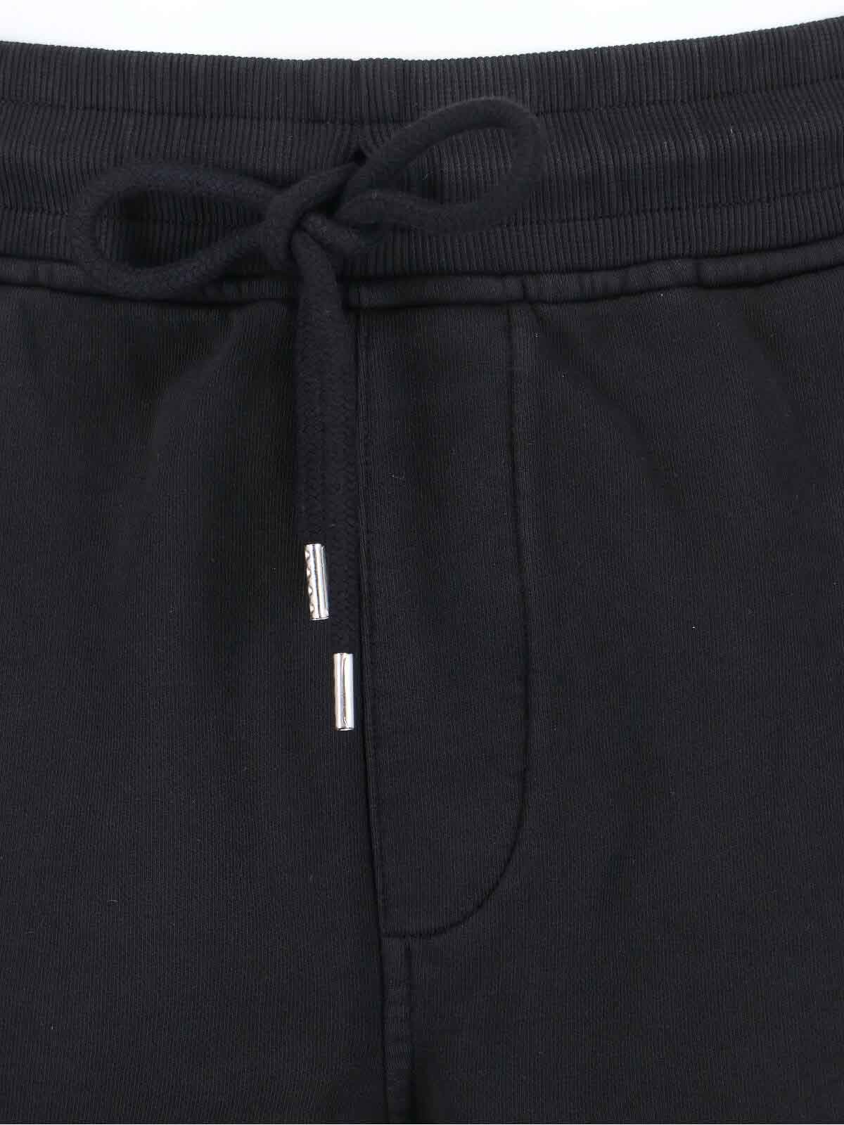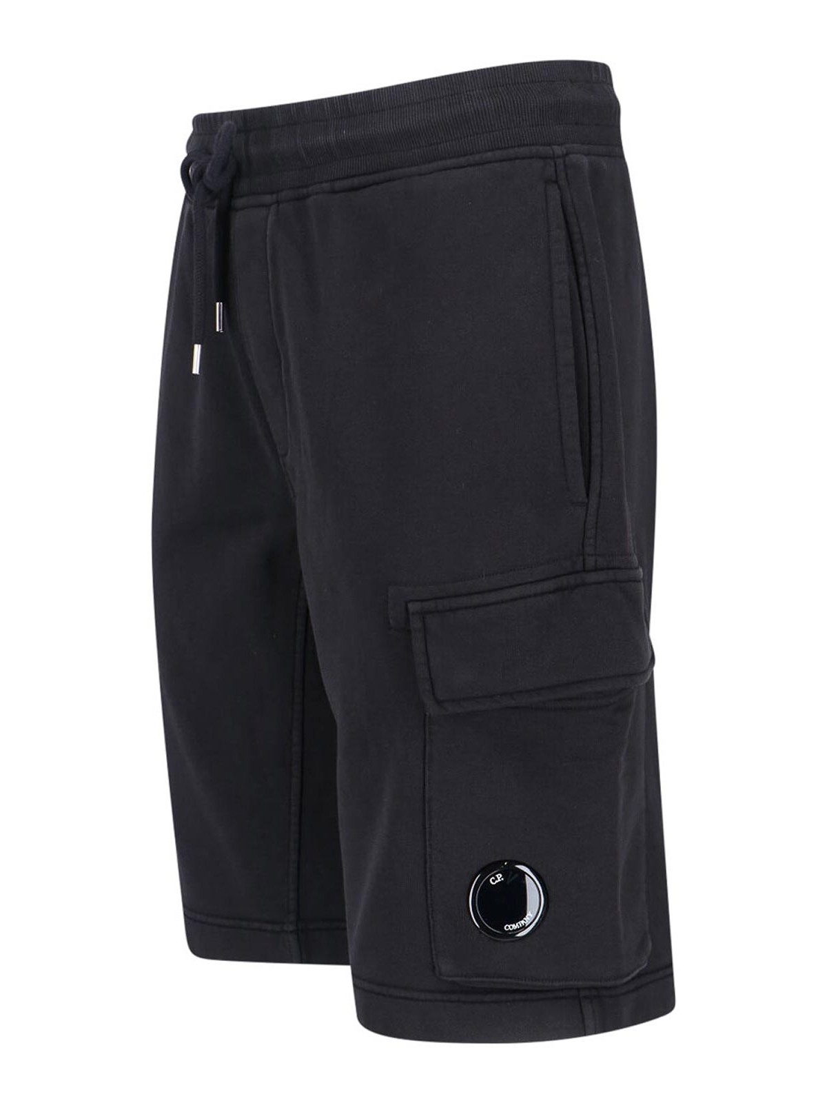 C.P. 社のレンズショーツ、ブラックコットン、中程度の伸縮性ウエスト、ドローストリングクロージャー、サイドポケット2つ、カーゴポケット1つ、サイドゴーグルのロゴディテール、ストレートレッグ。