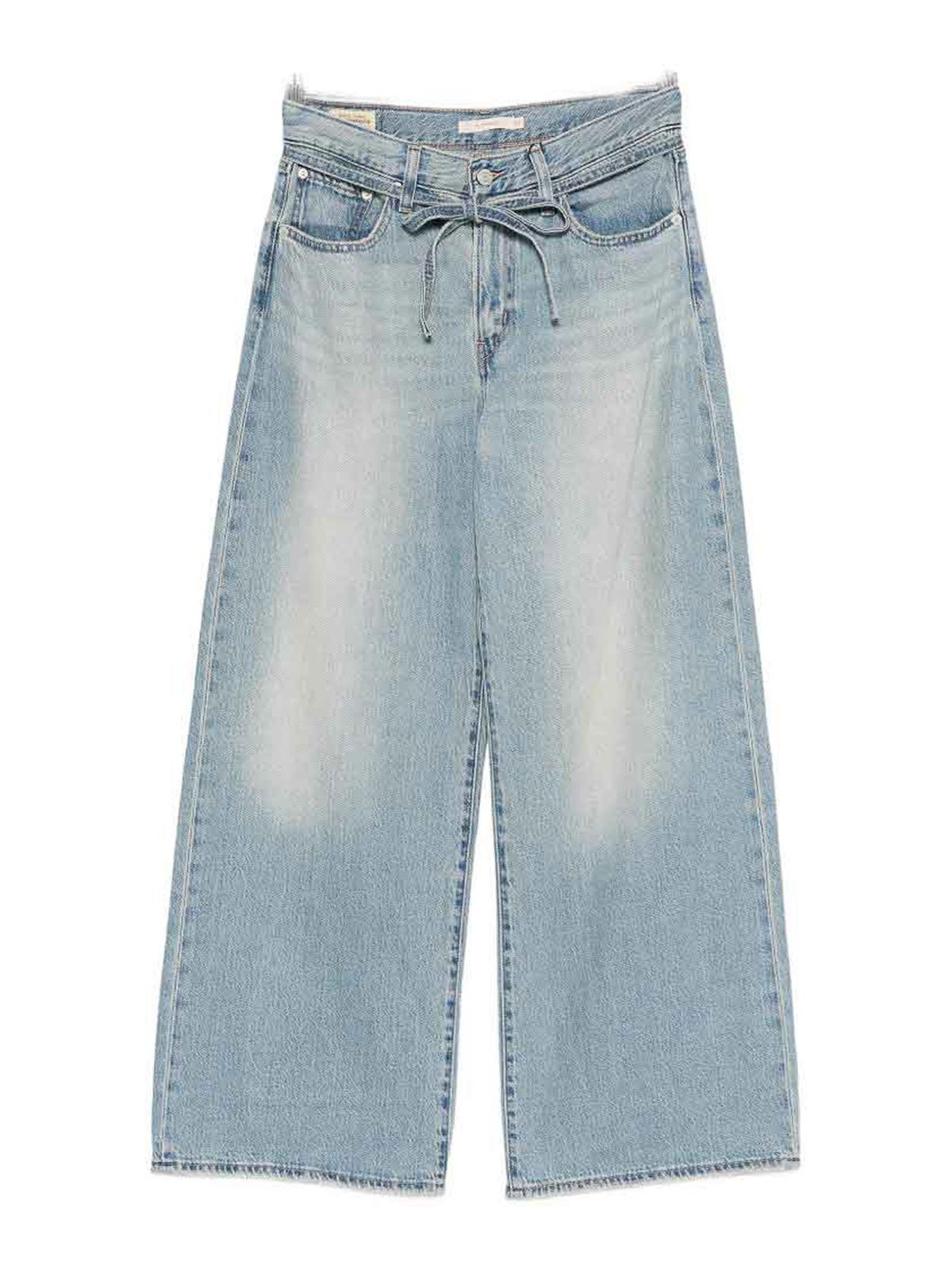 ウエストにブルーの結び目があり、ロゴ入りベルトループが付いています。