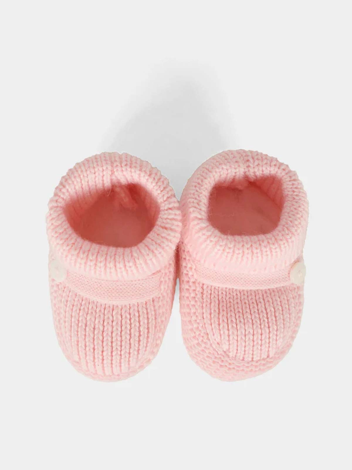 ボタン付きのピンクのストライプ、リブ編みのエッジ、丸いつま先が特徴のベビーシューズ