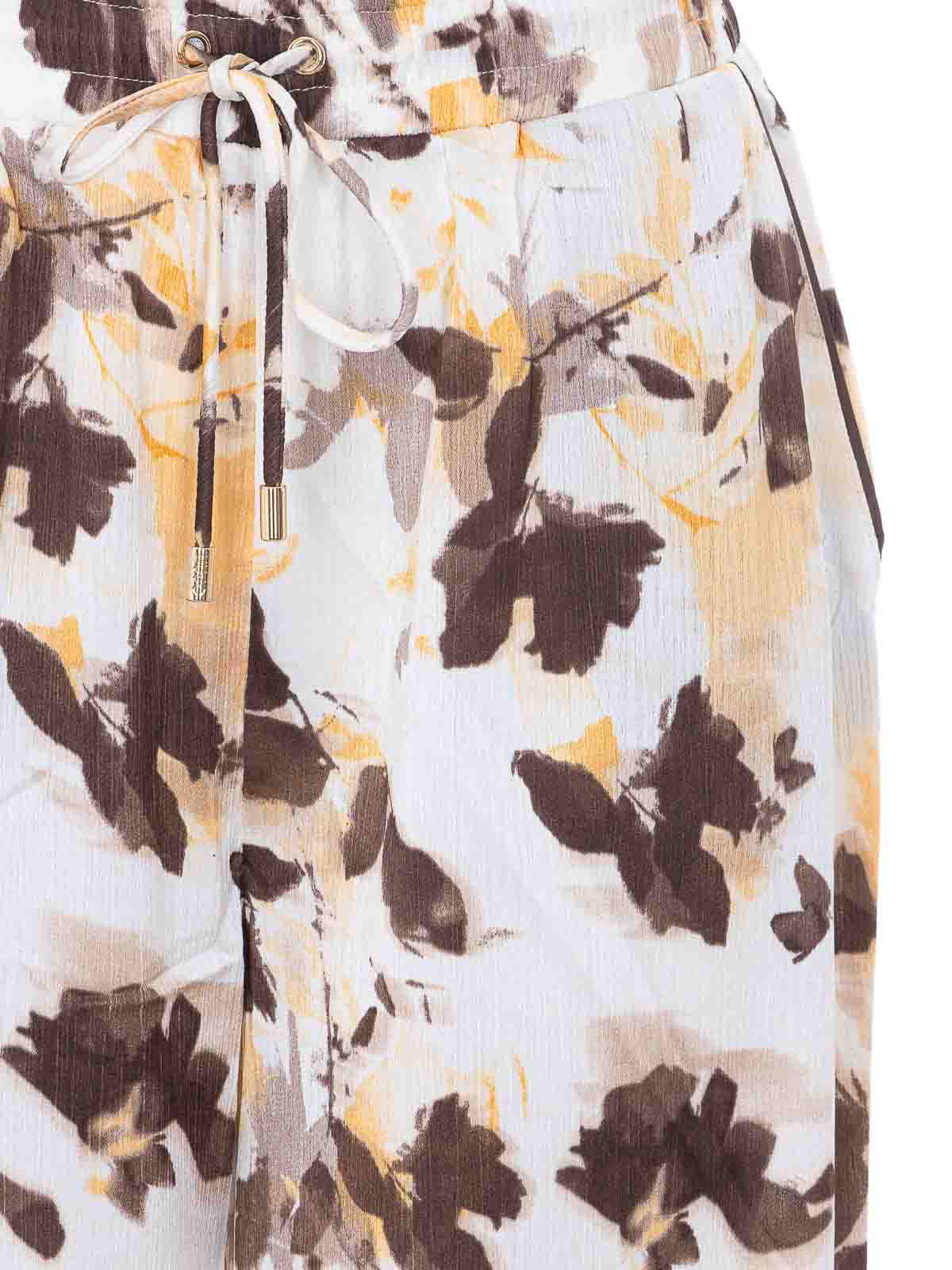 Liu jo ブラウンシェードパンツ、伸縮性のあるクロージャー、ワイドレッグ、花柄、前面にロゴ刺繍、プリント