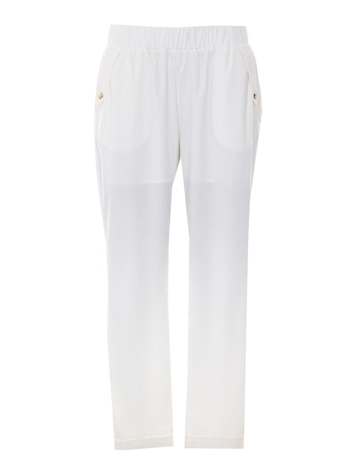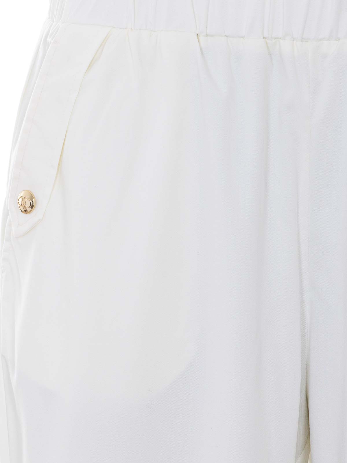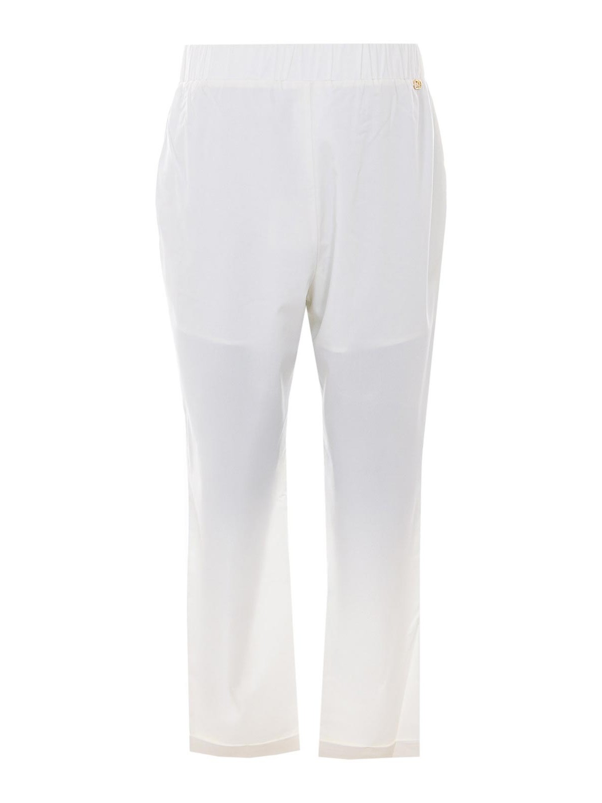 Liu Jo ミルクホワイトパンツ、伸縮性のあるクロージャー、バックロゴ、ロゴ入りフロントボタン、ターンアップ付き、ルーズフィット、バックロゴ