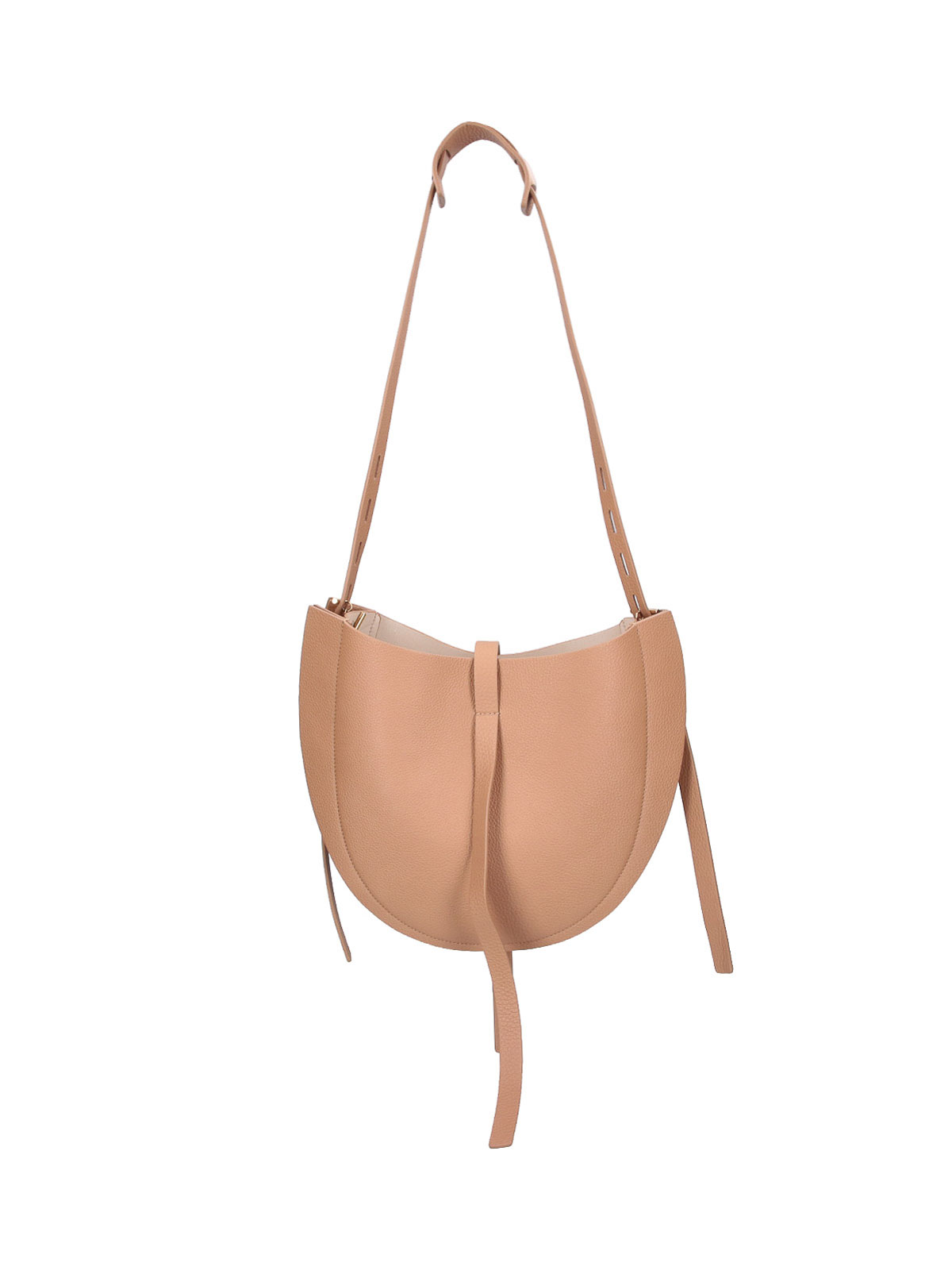 ピンクレザー製の小さなMinobossi Lizzieショルダーバッグ、調節可能なショルダーストラップ、フロントメタルクロージャー、内側にファスナーポケット1つ、メインの内部コンパートメント1つ。
