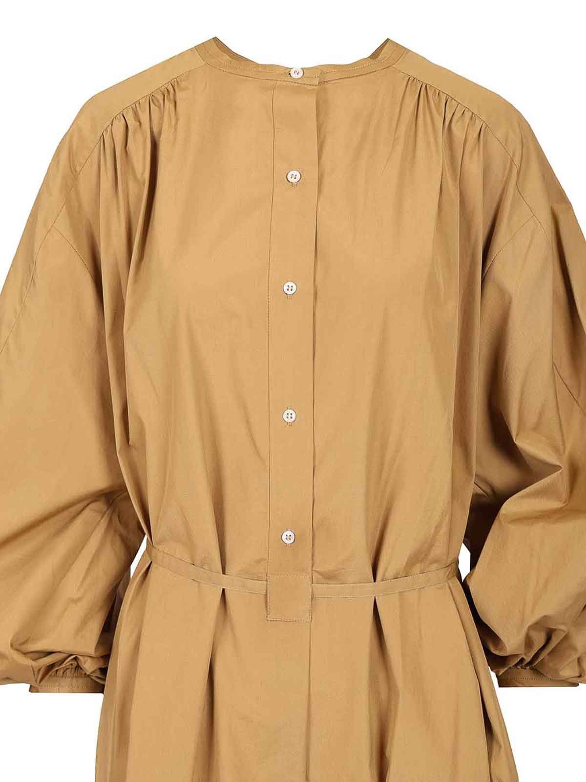 loulou de saisonのコットンポプリンを使用したヴィッティドレス、ルーズフィット、ワイドフィット、ミディフィット、袖口で調整されたラグランスリーブ、ハイカラー、隠しボタン、同じ生地のベルト。