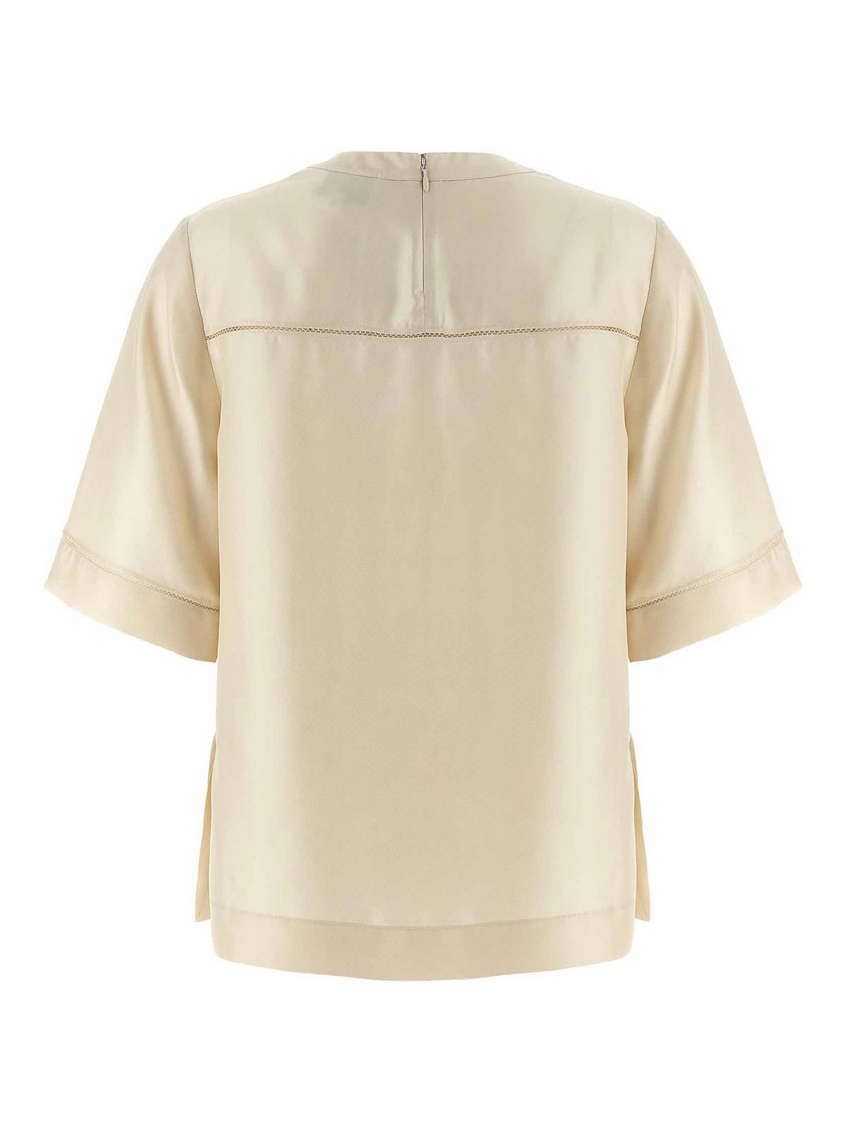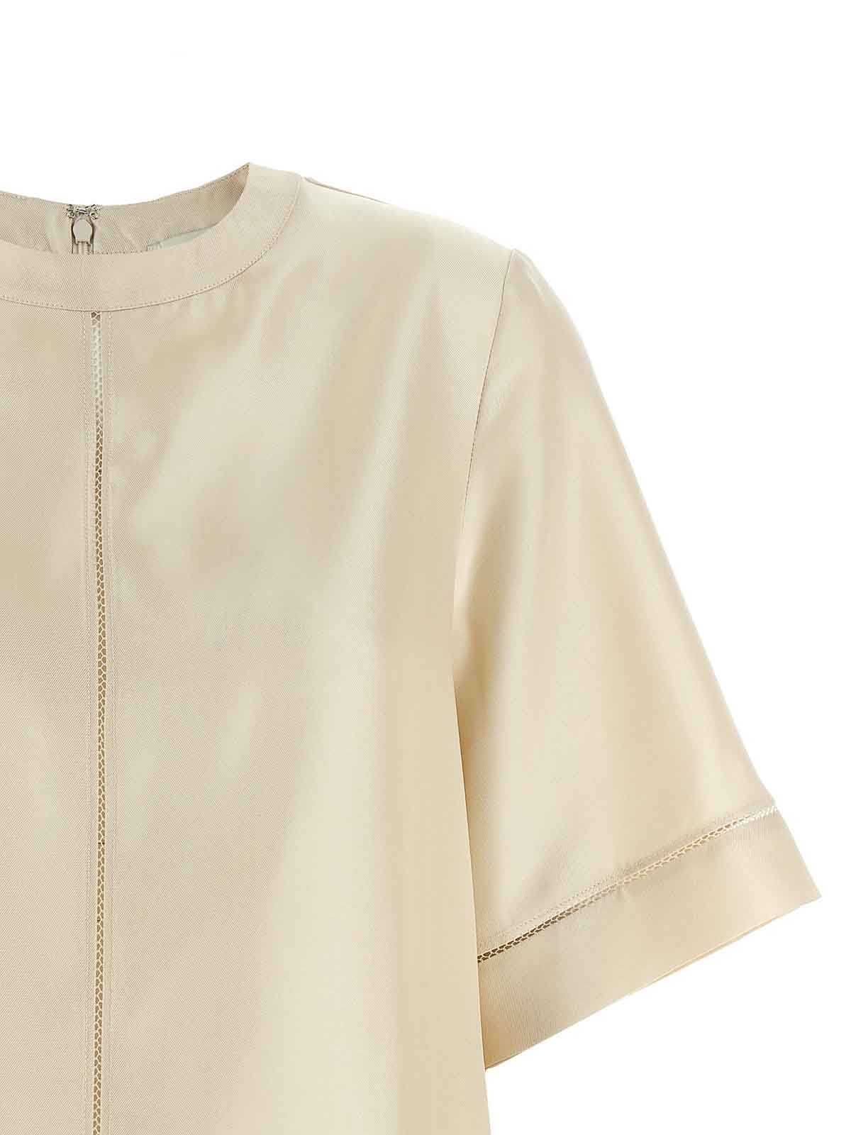 レースステッチインサート、クルーネック、バックファスナー、ワイドショートスリーブ、サイドスリット付きハバナシルクツイルトップ。