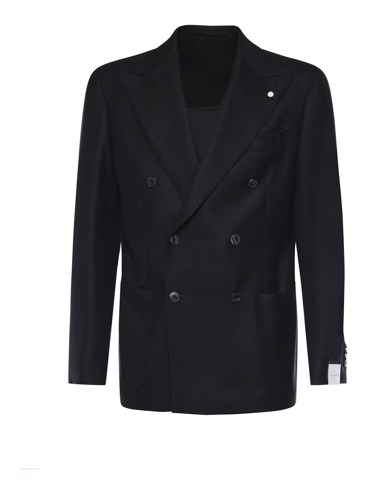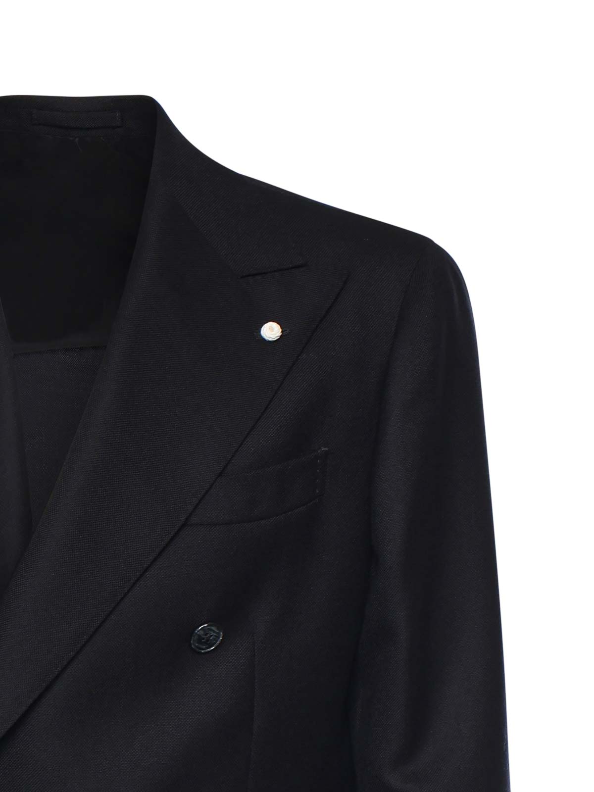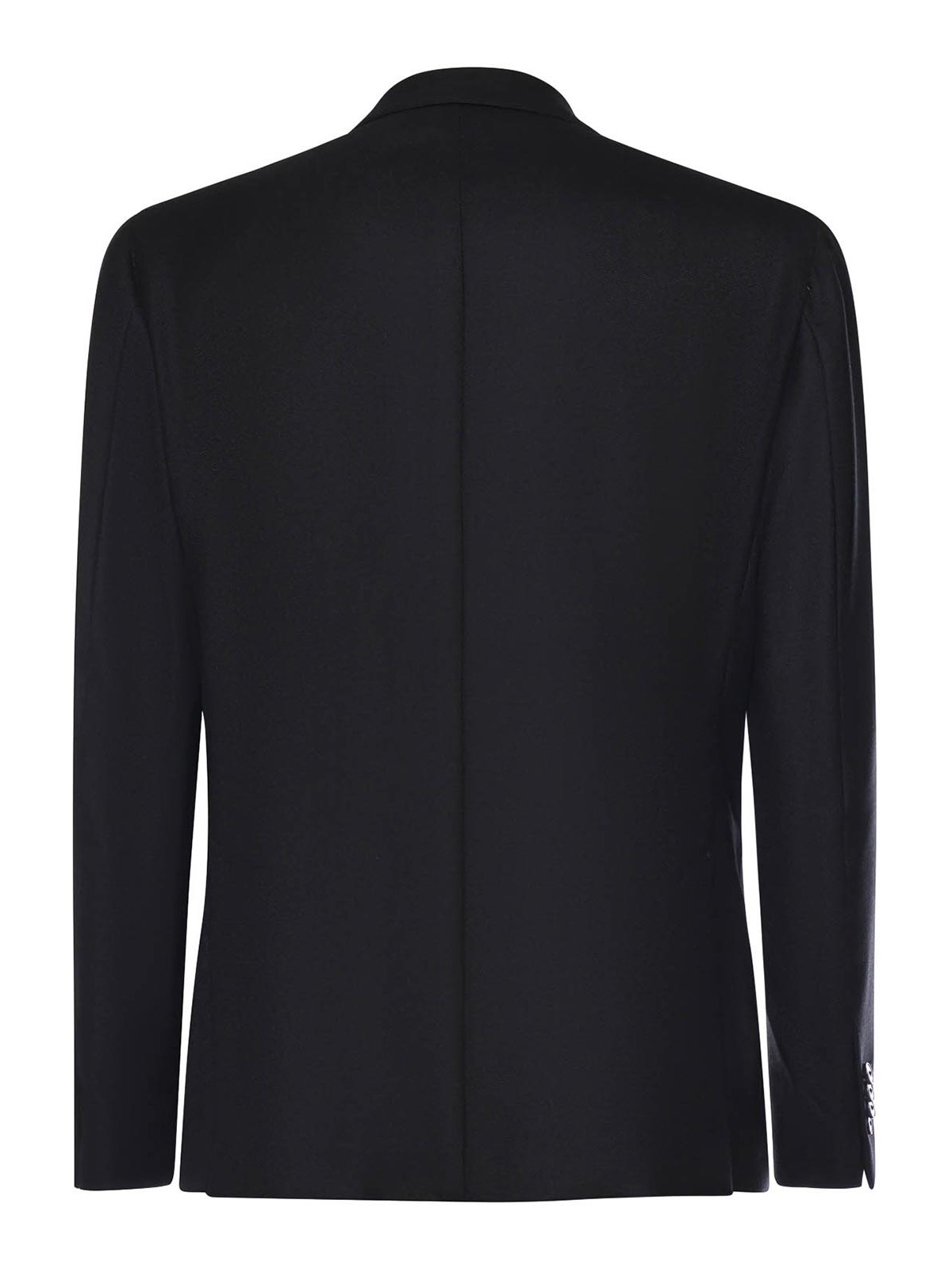 バージンウール製、ダブルブレストクロージャー、ピークラペル、胸ポケット、フロントパッチポケット、表示サイズは48、イタリア製、色:黒