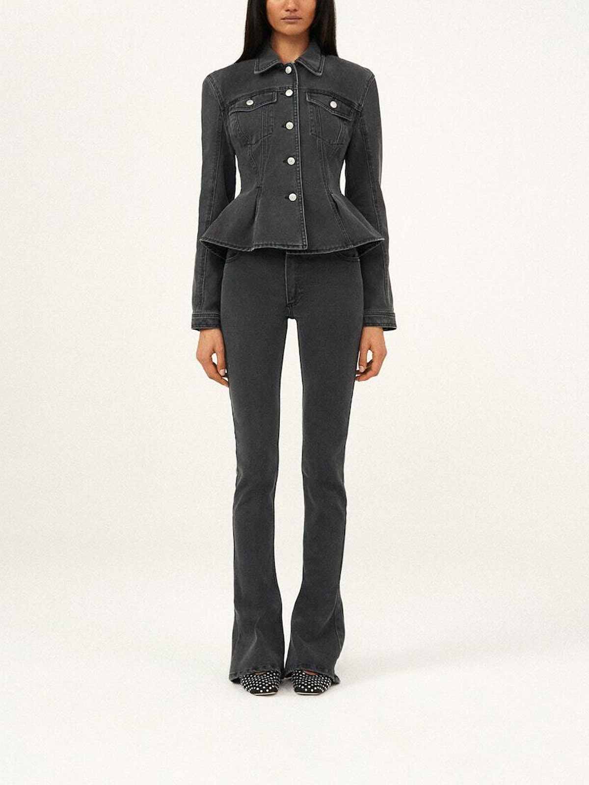 デザイナーカラー:グレー、コットンブレンド、ストレッチデニム、フレアヘム、フロントボタンクロージャー、スーパースリムカット、フロントポケット2つ、ベルトループ。