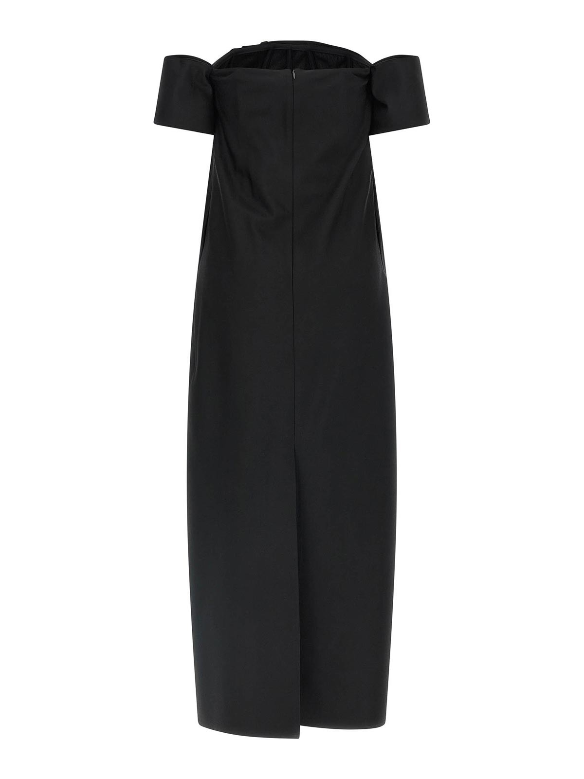 re26 dress ウールとシルクの混紡素材を使用した18インチドレス、オフショルダーのシースドレス、内側にレースビスチェをあしらったバックフック、ややカールしたストレートネックライン、バック中央にスプリット。