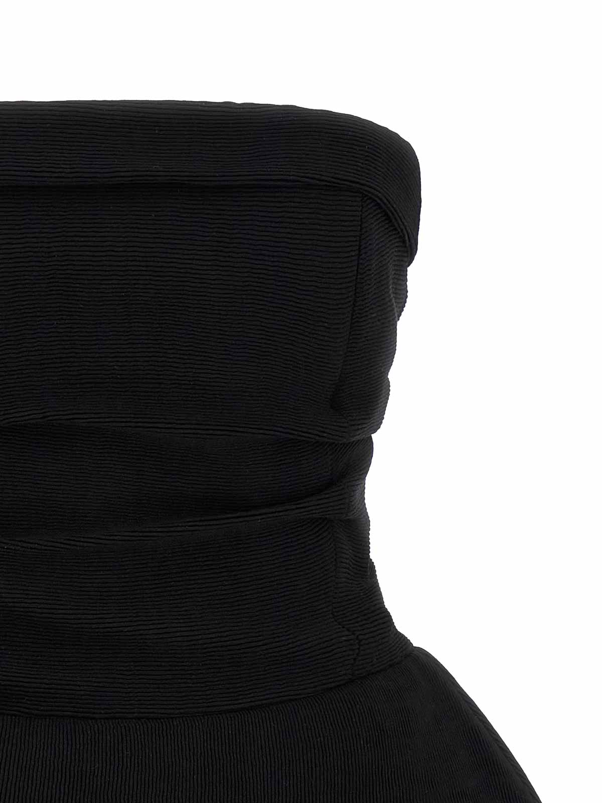 re26 dress 01インチリブ編みミニドレス、オフショルダーモデル、インナーレースコルセット、バックフック付き、バストにパッド入り、ドレープ柄、隠しジッパー付きバッククロージャー。