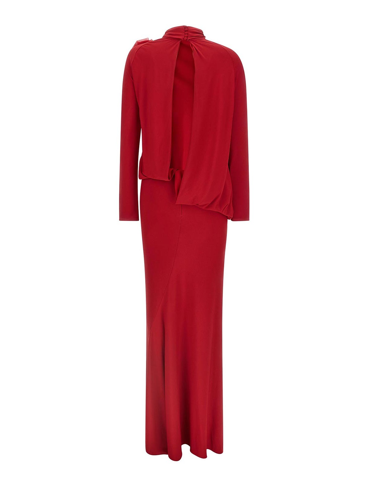 ロングドレス26ドレス 04フィートシャイニージャージードレス、背中にボタンが付いたハイネック、深いバックネックライン、ロングスリーブ、取り外し可能なフラワーディテール、安全ピン付き。
