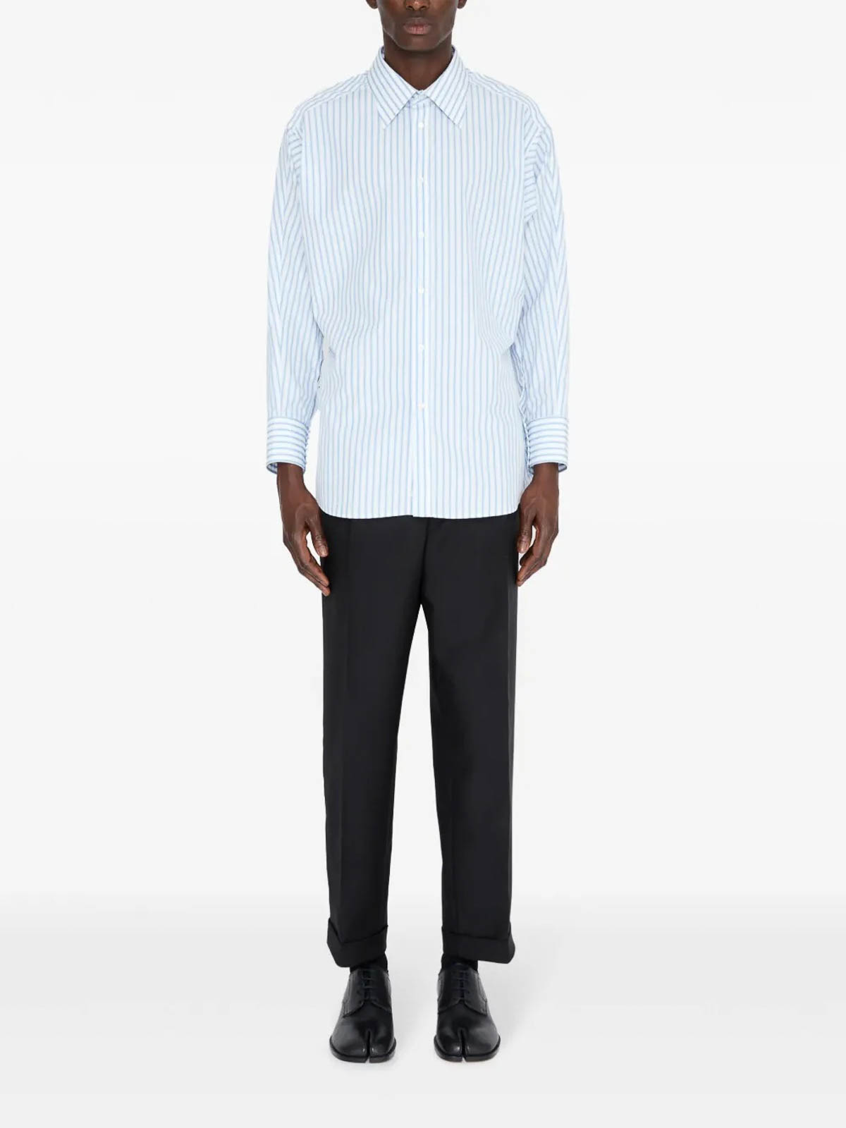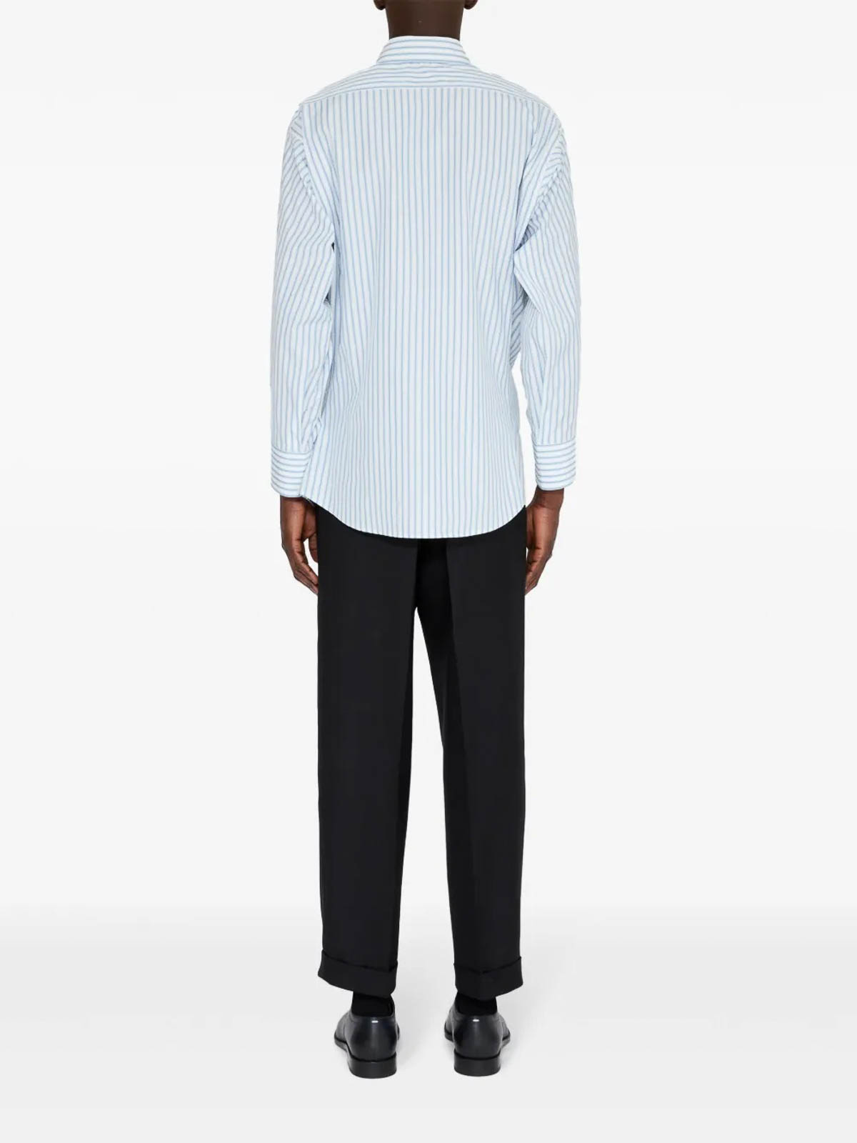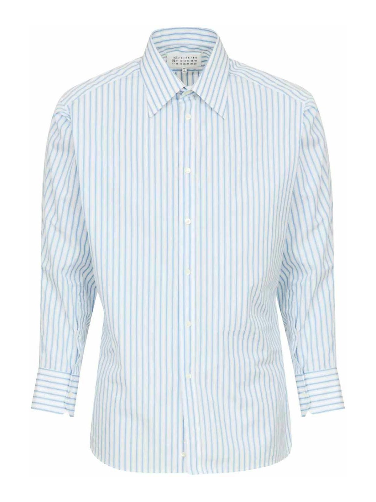 デザイナー/グレーブルー/ホワイトポプリンテクスチャー長袖縦ストライプ柄ボタンクラシックカラーボタン付きボタン付きボタン付きカフスカーブヘム